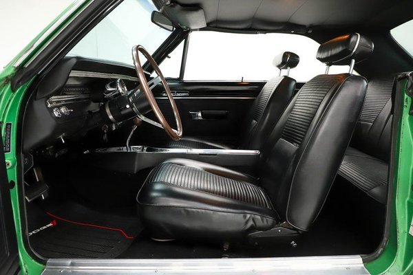 EXTERIOR: Believed to be the original paint! I just inspected it closely and other than a few minor blends I agree it is original paint. Overall, it shows great, with a gloss finish. Some of the edges are buffed thin. It has original glass including windshield which is a good indicator of low miles. Arguably the rarest of all Chrysler high impact colors Code F6 Bright Green was only available for a limited production run in the spring of 1969. The seasonal availability of the color not only makes it incredibly rare but also earned it the nickname "Spring Green". Even at the most prestigious of events, you'll be lucky to find a real deal "Spring Green" car. A new vinyl bumble bee stripe was just added. The original vinyl top presents well. The chrome and trim is exceptionally nice. The fender mounted turn signals are a very cool original option too. It's sitting on body color painted rims with poverty hubcaps and new BFG radial red line tires.