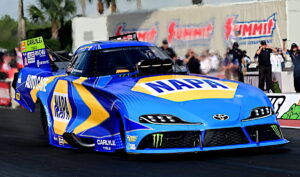Pomona is a local event for many NHRA Funny Car racers, none more than Carlsbad resident Capps and one of his regular combatants, Corona’s Jack Beckman. John Force Racing’s most tenured team member at this time, the 2012 champion has earned a winner’s time slip four consecutive times when he’s been on the entry list; Beckman was out of action after Don Schumacher Racing (DSR) quit the sport, but went to the Winners Circle in Pomona both before the end of the DSR era and afterwards, when he joined John Force Racing (JFR) after John Force’s 2024 accident. For his major sponsor PEAK, a win this weekend would be their third straight!