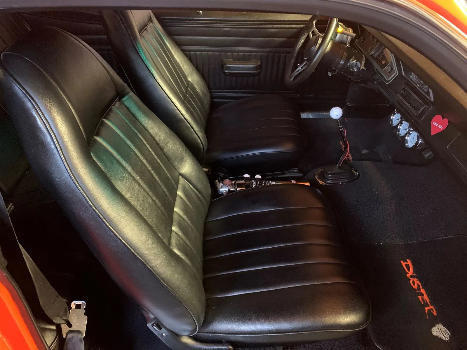 “Two original Chrysler Corporation car production broadcast sheets came with the car, so I was able to understand that this Duster was, in deed, a Factory 833 4-speed manual transmission (overdrive model).” What does that mean? A Factory 4-speed is a gear system that allows your vehicle to run at specific revolutions per minute, usually 1,000 rpm, at four different speeds, such as 1st, 2nd, 3rd and 4th gears, instead of just 4th gear (it is at .74 so it’s a four-speed with a wider ratio in 4th gear). The overdrive typically refers to a transmission that has four forward gears and an additional overdrive gear. Basically, an extra gear that allows the engine to operate at a lower speed, reducing fuel consumption and engine wear during highway driving. The ‘4-stroke’ aspect refers to the four stages of the engine: intake, compression, power, and exhaust. Overdrive ratios are 3.09 in 1st gear, 1.67-1 in 2nd gear, 1-1 in 3rd gear, and .73.1 in 4th gear. “My guess,” says Shayne, “is that it’s not the original transmission, but the OD is better for Sunday drives as the lower 1st gear ratio really pulls hard off the line.” Confused? Driving it can be even more daunting. I can understand why only 586 were made. To give you an idea, sometime after the purchase of the car, Shayne’s 17-year old son wanted to learn how to drive it. Shayne took him to the school’s parking lot to practice. “He had never driven a 4-speed car before, but assured me, that given the fact he played lots of video games, he would be very accomplished. I mentioned that I would take him to the gas station first just so he could get an understanding of what it really felt like to drive such a car, certainly one that was a little more rough around the edges than any video game. When we got to the school parking lot I went through the procedure a few times with him so he would understand the timing and what needed to be done between the parking brake, the clutch, the gas pedal, the gear shift, and all those moving parts. When he was in the driver seat he looked confidently over at me and said, don't be surprised if I'm really good at this. I went OK let's just see what happens. Needless to say he stalled the car seven times in a row. I showed him how it's done. I hopped into the driver seat, revved the car to 4,000, dropped the clutch and laid about 40 feet of rubber. When we came home, my wife asked me how it went. I said you need to ask your son. When he came in his mother ask him how it went, and he confessed, not very good. It was a humbling experience.”