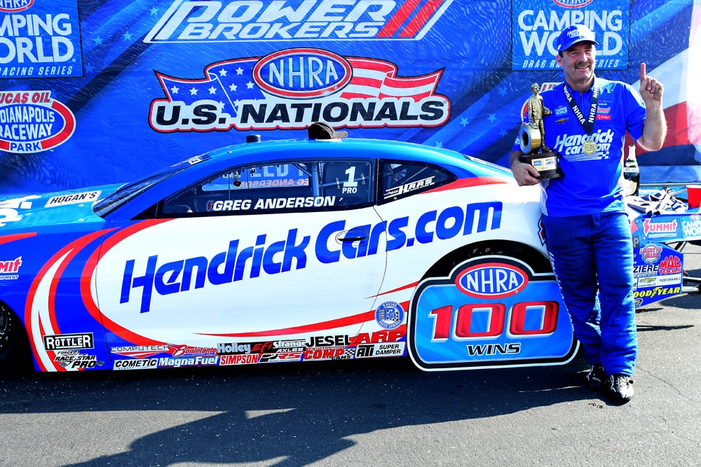 Pro Stock went to Greg Anderson, the five-time champ who’s been waiting since last November to take his 100th victory after notching No. 99 in Pomona at the season finale. The No. 1 qualifier, his relief was palpable. Anderson was joined in the Winners Circle by five-time Pro Stock Motorcycle champion Matt Smith. Smith raced his trusty Buell to the win over Karen Stoffer and will continue with it during the Countdown while he tries to figure out the clutch on his new Suzuki. This is not the time of year to be testing the logistics of a clutch, when a sixth title is on the line.