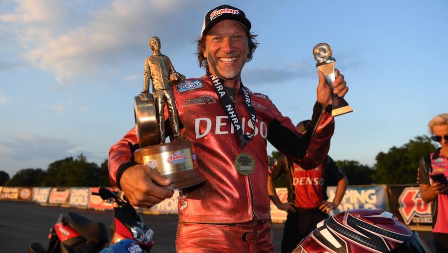 The most historically emotional victory of the weekend came from Pro Stock Motorcycle Series driver Matt Smith. Reaching Sunday’s final round with victories against Jianna Salinas, Ryan Oehler and Eddie Krawiec, Smith would have to stop Steve Johnson’s recent impressive run to earn the final victory. Although Johnson had been nearly untouchable the last two races on his new four-valve Slick 50 Suzuki, Smith’s 6.782-second pass at 200.56 mph on his Denso Auto Parts/Stockseth/Matt Smith Racing EBR, not only gave him the victory over Johnson, but also broke the track E.T. record that Johnson previously set during Saturday’s qualifying sessions.