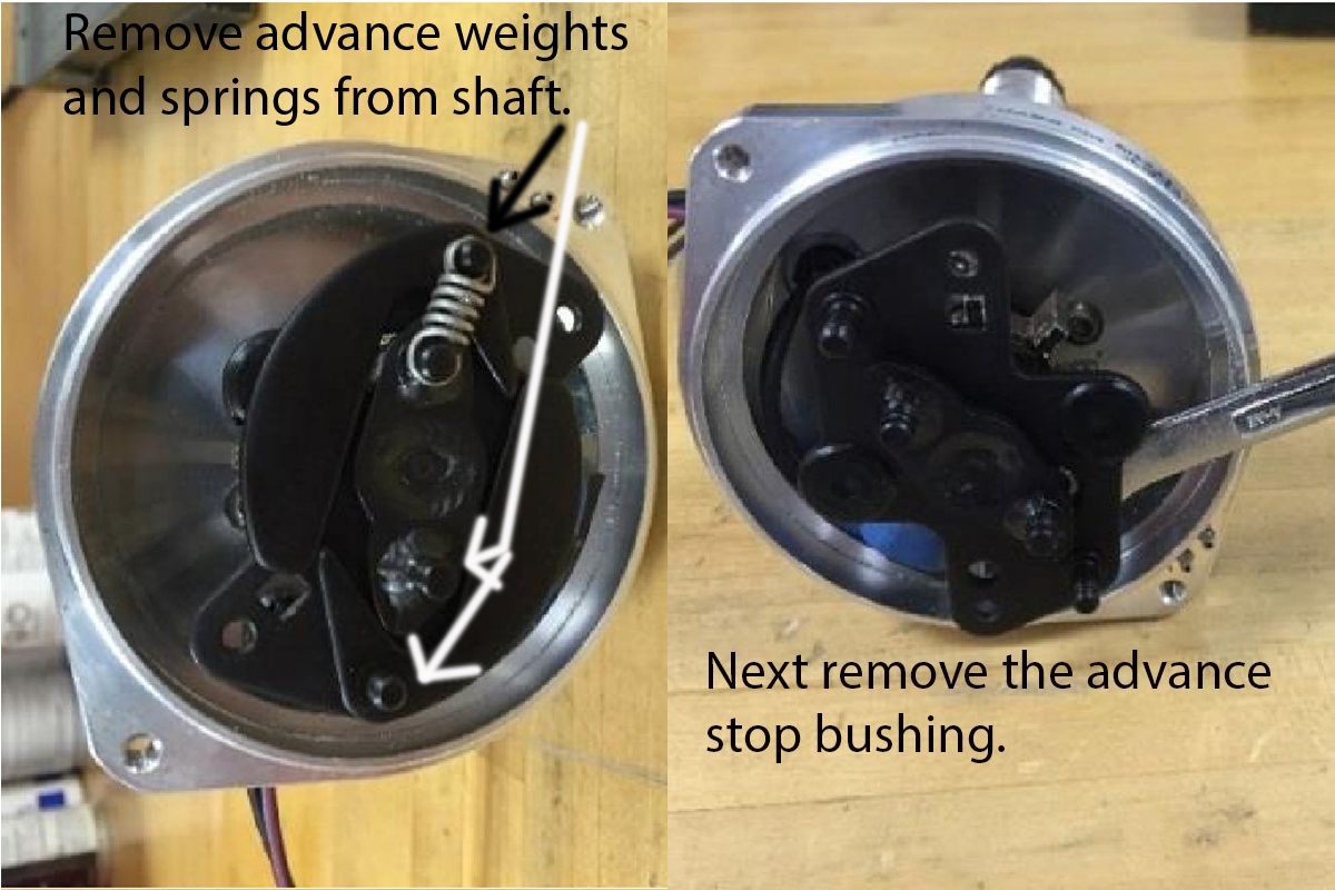 1. Remove the rotor and all advance components. Be sure to get the lock nut, the springs and weights and the advance stop bushing from the distributor’s advance assembly.