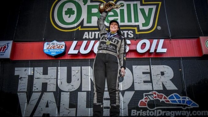 Kicking off her magical weekend at one of her favorite places to race – Bristol Dragway – Alexis DeJoria earned her first No. 1 qualifier since 2016 with the quickest run of the event in the class. Sunday’s final elimination rounds would give DeJoria the chance to knock off Paul Lee in the first round before earning a bye run in Sunday’s second round. Her next big challenge would come in Sunday’s semi-final round, where DeJoria lined up alongside three-time Funny Car world champion, Robert Hight. Although the John Force Racing superstar put up one heck of a fight, DeJoria would once again come out on top with a 3.904-second pass at 327.74 MPH to give her a chance to take on yet another former Funny Car champion in Sunday’s final round. Despite taking down last week’s Funny Car winner Ron Capps in Sunday’s semi-finals, J.R. Todd would not have what it took to stop the newest queen of speed in the final thanks to DeJoria’s final 3.921-second run at 327.66 MPH. After breaking a four-year dry spell with “one of the biggest wins of her career,” DeJoria said that “coming back after two years off and working with her mentor and friend Del Worsham is huge.