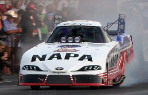 In Funny Car, it was a battle of champions in the final round. While SCAG Racing’s Daniel Wilkerson and Dave Richards battled first as lower qualifiers, it was Ron Capps against Cruz Pedregon in the finals, where Capps was using his tribute Don “The Snake” Prudhomme Toyota body. Capps made it to the stripe before Pedregon, in a very tight battle that ended up with Capps in the winner’s circle with his blast of 3.858 seconds at 302.21 miles per hour. Pedregon’s time to the stripe was slower at 3.885 but his speed was faster at 327.51 mph.