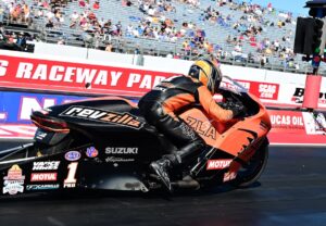 Pro Stock Motorcycle is, once again a Vance & Hines vs Matt Smith Racing battle at the sharp end. Gaige Herrera and Richard Gadson lead into the Countdown on their Suzukis, with Matt Smith, teammates John Hall and Angie Smith following on their Buell motorcycles. Chase Van Sant’s Suzuki is sixth, Jianna Evaristo completes the Matt Smith Racing group in seventh, while Chris Bostick, Brayden Davis and Steve Johnson round out the top 10, riding Suzuki motorcycles.
