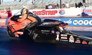 Herrera, from his No. 1 perch, knocked off fellow Suzuki riders Karen Stoffer and Clayton Howey before the thrilling semifinal round against Gadson. While his teammate had a perfect .000 reaction time, Herrera was no slouch at .005 for his start, then put up a 6.825 lap to beat Gadson to meet Angie Smith’s Buell in the final round. Herrera went 6.809/198.17 to defeat Smith’s close 6.813/199.37 lap. “This couldn’t have gone any better,” Herrera acknowledged. “Me and my teammate facing off in the semis, with him in the points lead, I needed him to go out to get a little closer. What a race between me and him, my .005 light to his perfect .000 light. It just doesn’t get any better than that. It also goes to show how hungry we both are to get this championship right now.”