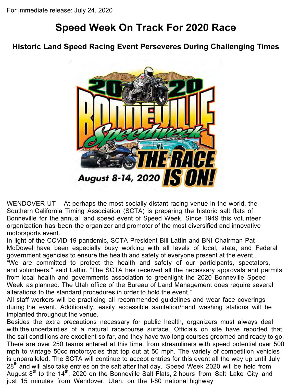 With several tracks and events being postponed or canceled for unable to follow safety guidelines, for Speed Week fans, Bonneville by nature is a socially distant event. Bonneville recently released this statement below followed by the full event schedule.