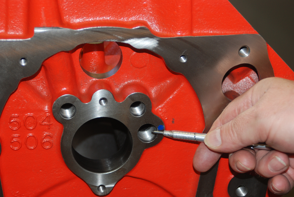 Previously we touched upon long strokes and oil galleries. Here’s what we were talking about. This block has been clearanced for a long stroke crankshaft. This means that the block is ground internally so that the crankshaft counterweights and connecting rod caps don’t hit the block casing. This particular bow tie block will accept a stroke of 4.50-inches, with no further modifications. Coupled with the as-delivered bore size of 4.560-inches, that means this big block can conceivably have a final displacement of 588 cubic inches. Boring the engine block to maximum increases the potential displacement to 598 cubic inches while additional block work (more clearancing) and an increase in stroke to 4.75-inches can result in a final displacement of 632 cubic inches.This is a dead giveaway a specific block is a superior piece – all heavy duty Chevy Performance Parts blocks come with bow tie cast into the assembly, adjacent to the oil pan rail. The first big block bow tie cases saw service in 1983-1984. HD blocks from Chevy are really nothing new.One thing that is new is the one-piece rear main seal. Chevy bow tie blocks can typically be purchased either way – one-piece rear main seal or old style two-piece rear main seal. In the case of the big block, the seal type has nothing to do with the crank flange bolt pattern, but it does require a dedicated crankshaft.Like it’s earlier Mark IV special high performance counterpart, the bow tie block casting is designed to accept an external oil cooler. The cylinder block is also dry-sump oiling system friendly (the back of the block has a direct port to the main oil gallery, just behind the intake valley). In addition, these blocks will accept a vintage style clutch ball stud (some earlier Gen V blocks from Chevy did not have the boss drilled).