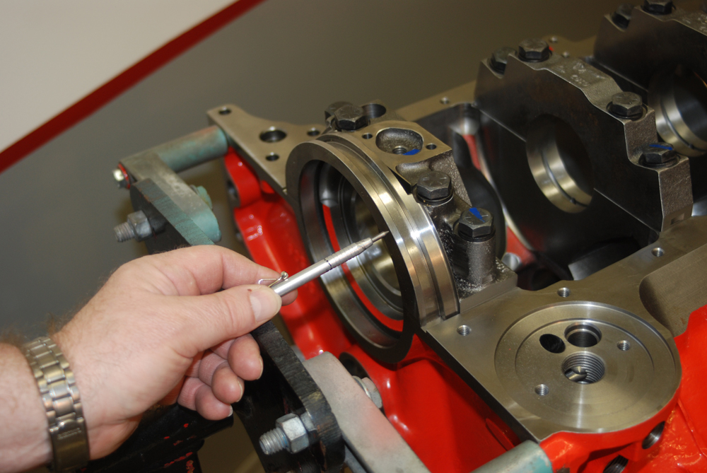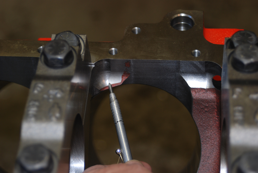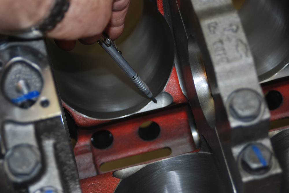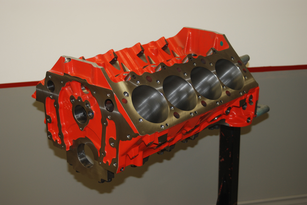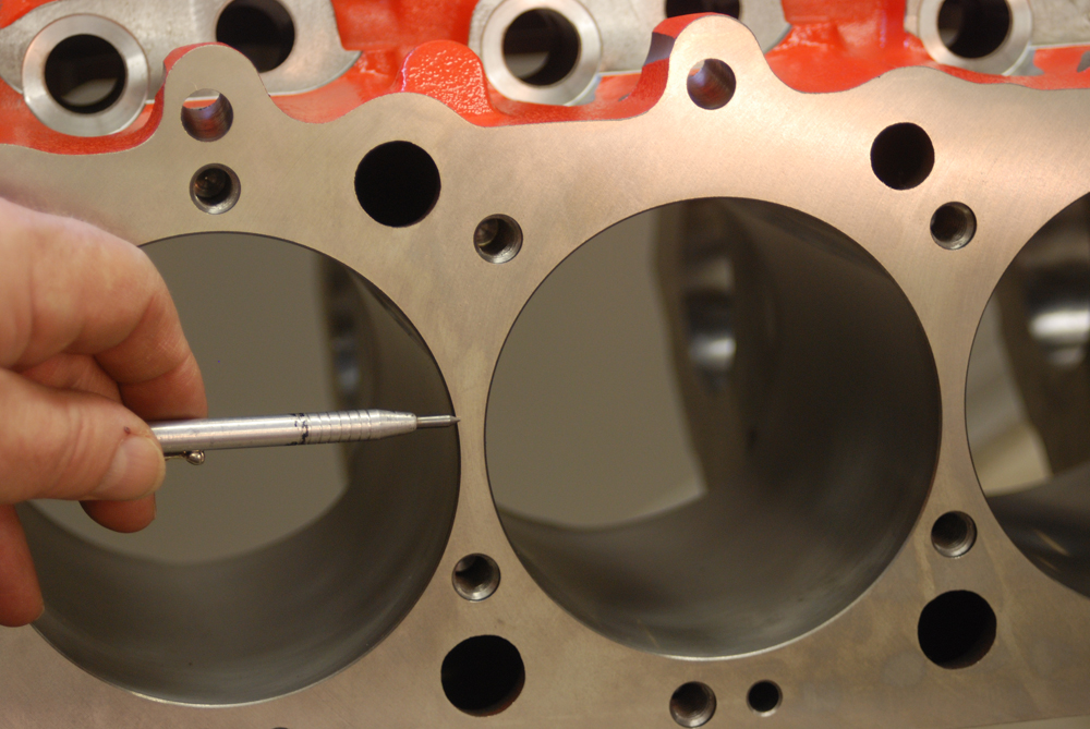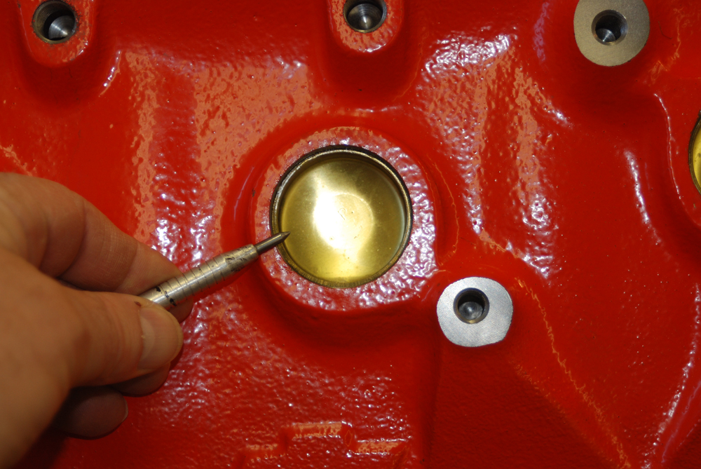 Look closely at this photo. What you see is the main oil gallery. On late model big blocks such as this, the oil gallery is placed up high, next to the cam tunnel. On earlier big blocks, the main oil gallery was positioned between the oil pan rail and the main journal tunnel. In that case, the block was limited to the amount of stroke it would accept (clearancing the block for big strokes wasn’t entirely possible since the builder would eventually “hit oil” – more later). There’s more, too: If a connecting rod departs on an early block, it usually takes out the oil gallery. Here, there’s a chance it won’t, since the gallery is so high in the casting.Brass core (or “frost” plugs) are installed in the CNC bow tie blocks. Brass is superior in that it doesn’t rust in this application. It’s also better looking. In circle track racing, the soft plugs are either pinned (two or three pins on the circumference) or epoxied in place so they don’t pop out. That practice isn’t necessary in a street-driven vehicle.Chevy Performance Parts Bow Tie blocks, for the most part, are based around “siamesed bores”. That means there are no water passages between the adjacent cylinders. The maximum core diameter of these blocks is (+ or -) 5.060-inches (big block cases), which allows for big bores. Additionally, these blocks have reinforced decks, which improves head gasket sealing. What about cooling with siamesed bores. The bottom line is, it’s not an issue.