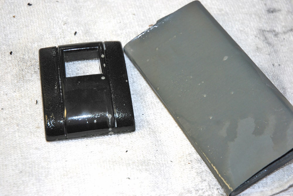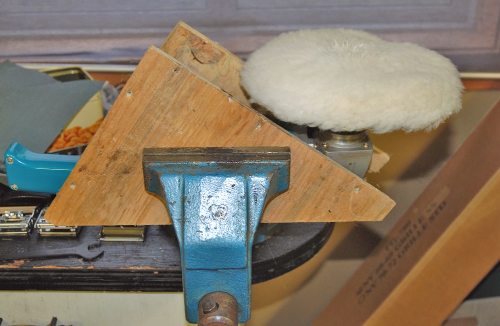 The plastic buckle covers are just as easy to detail. Here, I simply wet sanded the scratches with 2,000-grit sandpaper mounted on a rubber-sanding block. Just like polishing automotive paint, I used a mix of household liquid dish soap and water as the lubricant. Be sure to flood the cover with the soapy water mix, as you’re wet sanding. By the way, if you soak the sand paper over night in a tray of soap and water, it works better. Next, the covers were hand polished with a good plastic polish. Finally, I applied a light coat of automotive paint swirl remover on the buckle bodies and buffed with a wool pad mounted on a Makita variable speed buffer (turned to low). It’s tough to handle the big buffer on a small part, but the buffer can be clamped upside down in a shop vice. I did that. This allowed the buffer to remain stationary while I moved the buckle over it. I did use a couple of pieces of plywood on each side of the buffer to keep the vise jaws from destroying the buffer. In the end, the results were fabulous.