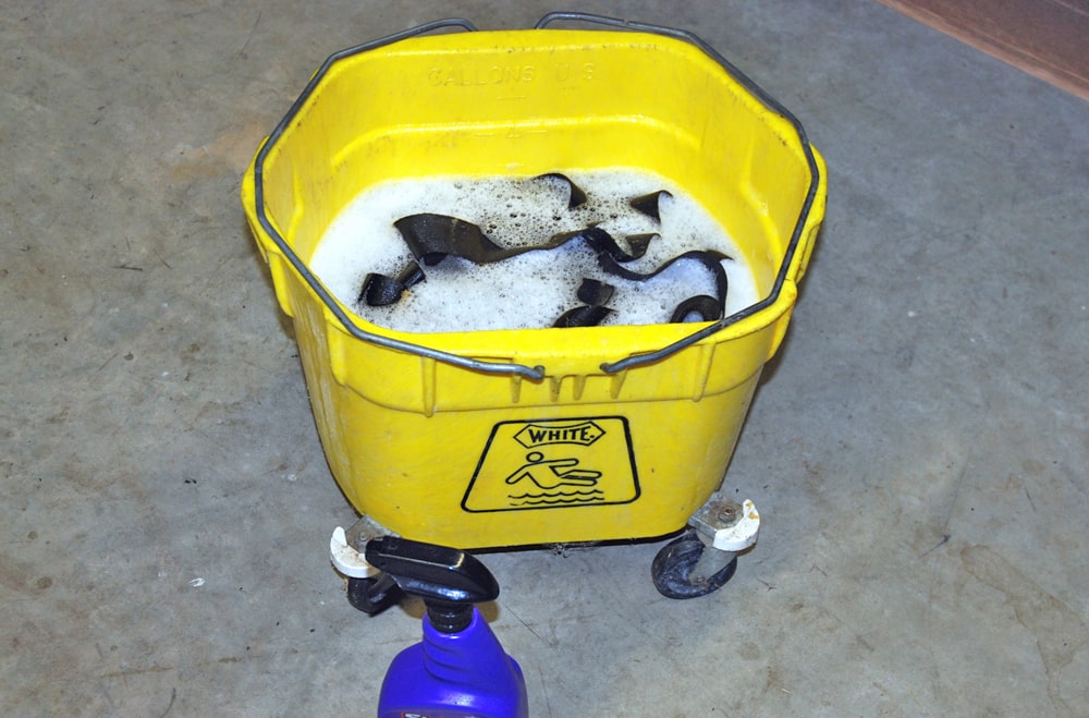 Next up, it’s time to clean the bare belts and harnesses (keeping in mind you cannot remove anything sewn in place). I prepared a 5-gallon wash bucket with hot water (right out of the hot water heater) along with a splash of common Purple Stuff automotive degreaser. In my case, the belts weren’t excessively soiled, but they had their fair share of cigarette smoke residue. I used a mix of approximately 25:1 – 12 fluid ounces of degreaser to 2.5 gallons of water (although for belts that are heavily soiled, you might have to use a bit stronger mix). With the belts completely submerged in the water/degreaser mix, simply stir occasionally and allow the cleaner to work. I continued this for a couple of hours. The belts were eventually rinsed with cold tap water, and then I “recharged” the bucket with another mix of hot water and degreaser. I followed the same steps. Once again, the belts were rinsed. I kept rinsing until the water in the bucket came out squeaky clean.