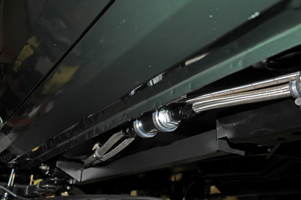 A big Holley billet inline fuel filter was mounted under the passenger seat area. Due to the irregular shape of the floor pan, four spacers were required to locate the filter. This arrangement allowed for easy access to the filter (keep in mind, the HydraMat also acts as a pre-filter). From this point, the pair of fuel lines follow the frame connector, then loop over the top of the passenger side frame connector to join the inner side of the rear subframe. Finally, pressure and return lines hook up to the bulkhead fittings at the leading edge of the gas tank.