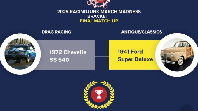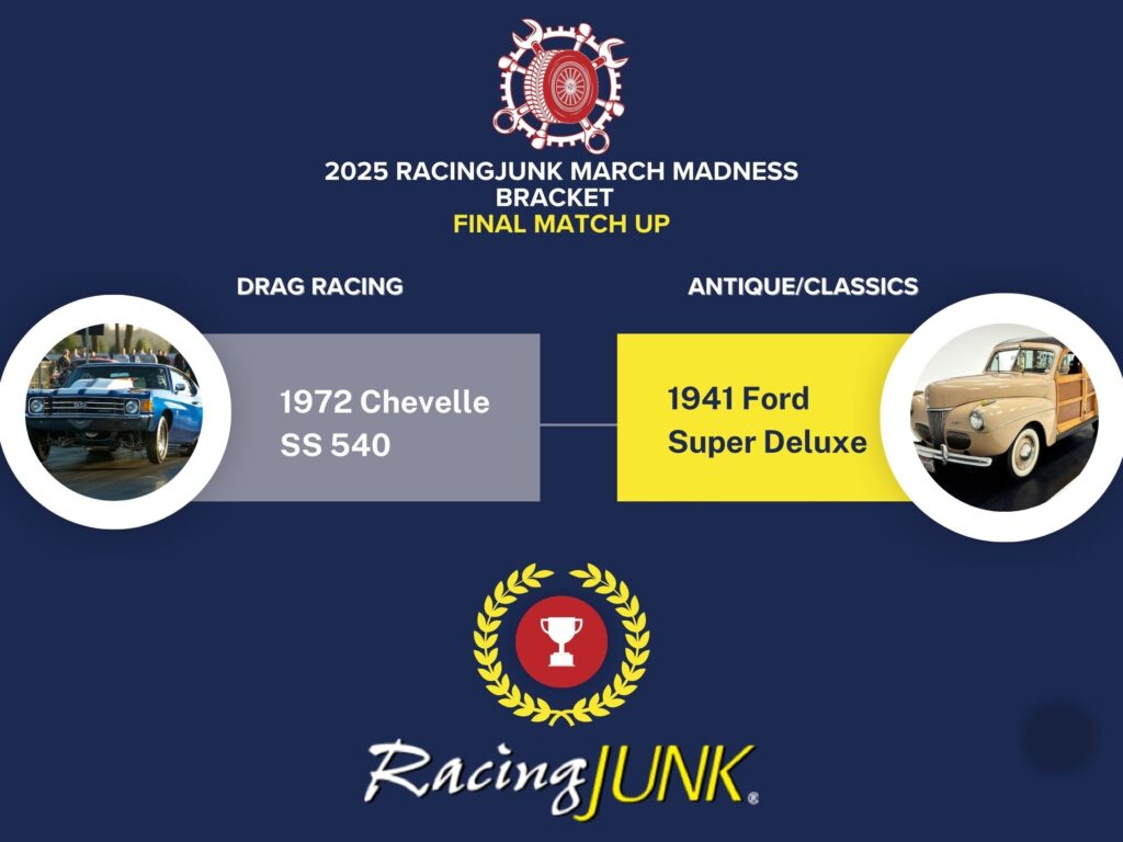 The engines are roaring and the votes are in—after a thrilling Final Four, the 2025 RacingJunk March Madness Bracket has come down to two iconic titans of American automotive history. It’s a battle of brute muscle vs. classic style as the 1970 Chevrolet Chevelle takes on the 1941 Ford Super Deluxe in the championship round. Thousands of fan votes have led us here, and now only one can be crowned the ultimate fan favorite.
