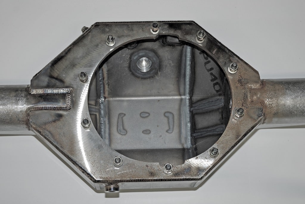 In terms of construction, Jerry Bickel builds the center of his Pro housings with 4130 chrome moly steel sheets. The center section cone components are cut and folded and then mated to the faceplate by way of Tig welding (beautifully, by the way). As pointed out above, the faceplate is precision milled. You can see the milling marks in the accompanying photos. That means the center section will bolt in correctly. As pointed out above, the chrome moly axle tubes are 3.250-inches in diameter. They’re locked into the center section by way of an internal bulkhead. The axle tubes are in turn completely welded (360 degrees) to the inside of the bulkhead, welded to the faceplate and completely welded to the exterior cone. The bottom line here is that the tubes aren’t going anywhere.