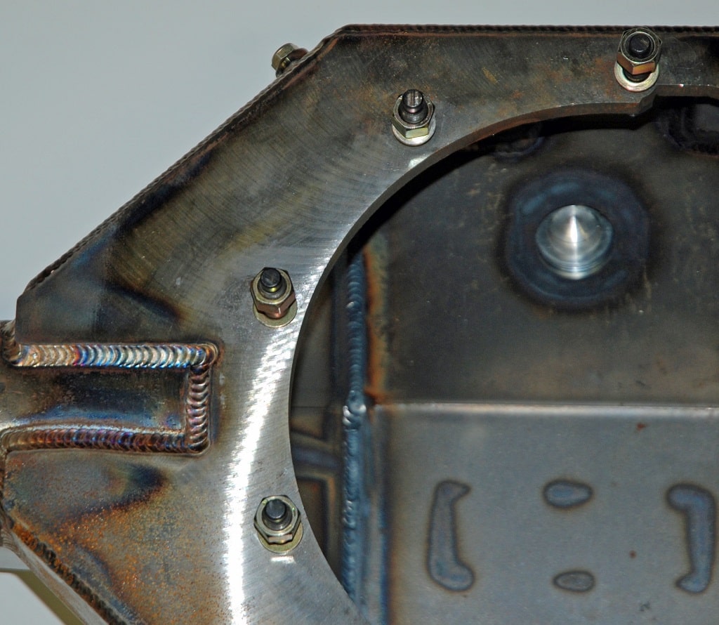 As you’re probably well aware, it's standard practice to add a "box brace" to the rear of a Ford 9-inch. A “box brace” essentially ties the ends of the axle tubes to one another, and at the same time anchors the back of the housing. This addition greatly increases the strength of the housing, eliminating the trend for the housing ends to physically move forward and aft. So far so good, but some high horsepower, heavy cars still manage a mere eight to ten runs on a given ring and pinion set with a modified Ford housing. Now if your piggy bank can't afford a new gear set every race (and who can?), here’s a suggestion: Virtually all 9-inch housing "banjos" are stamped assemblies. Under the strain of fat, sticky tires, added weight and a stout power plant, the stamped construction really doesn't cut it. The result is normally housing flex (at the carrier) that renders pricey ring and pinions useless after a few short passes down the 1320. A big part of the problem is the actual rear "cover" found on the housing. The back plate isn't one piece; it's usually pressed into the housing. The chassis builder is forced to really examine the problem: The hypoid action of the third member still tries to push the rear end out the back of the housing, which exerts forces on the entire third member assembly. Simply welding the cover to the back of the housing isn’t a 100% fix.