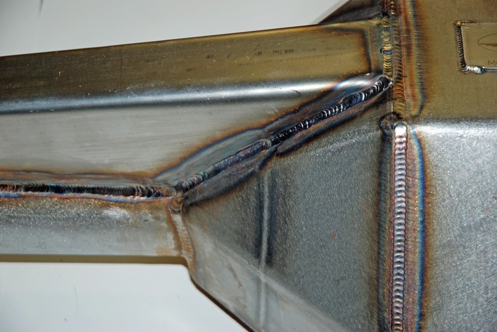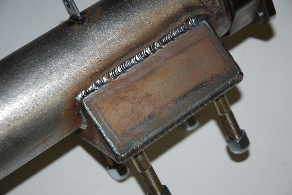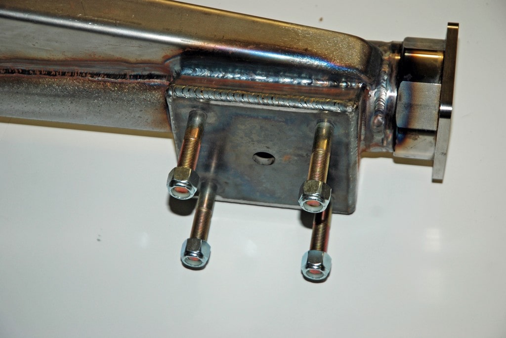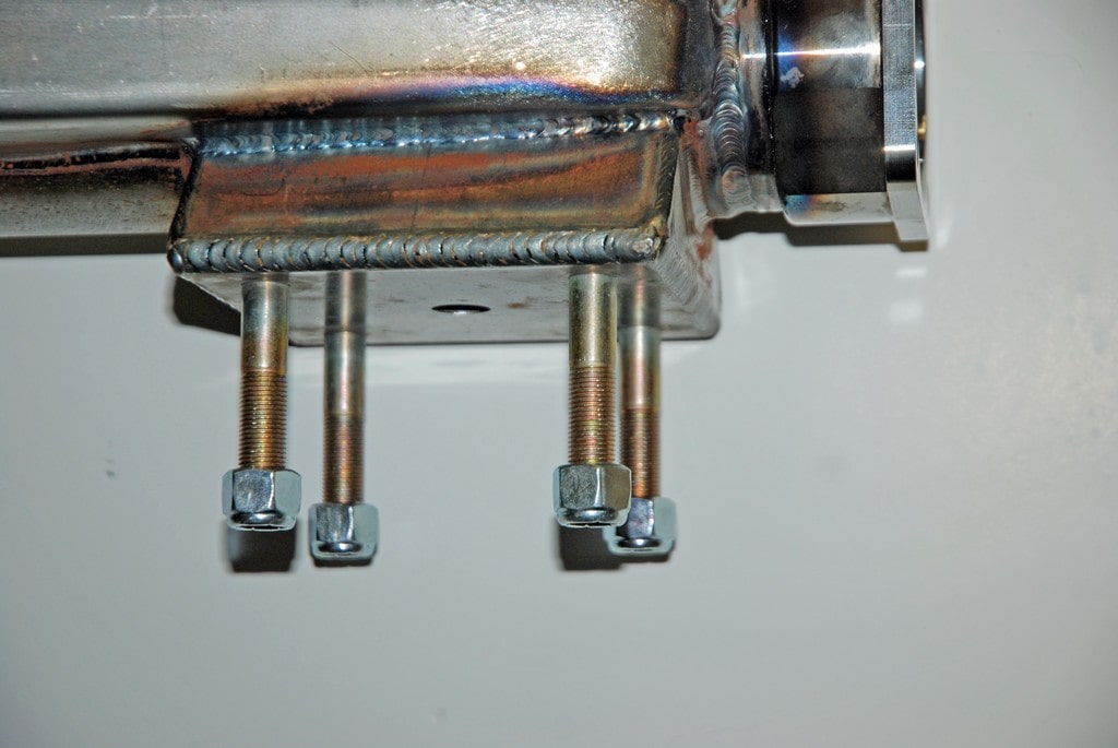 There is a better idea, though, and that’s the Smith Racecraft perch. It’s an all-new design that allows for a large amount of contact area with the housing on four sides (welded where it attaches to the housing), plus it eliminates the U-bolts. Instead of U-bolts, the Smith Racecraft housing end incorporates four locked in studs to mount the lower traction bar plate (which in turn sandwiches the spring). The end result is a much stronger spring perch arrangement.