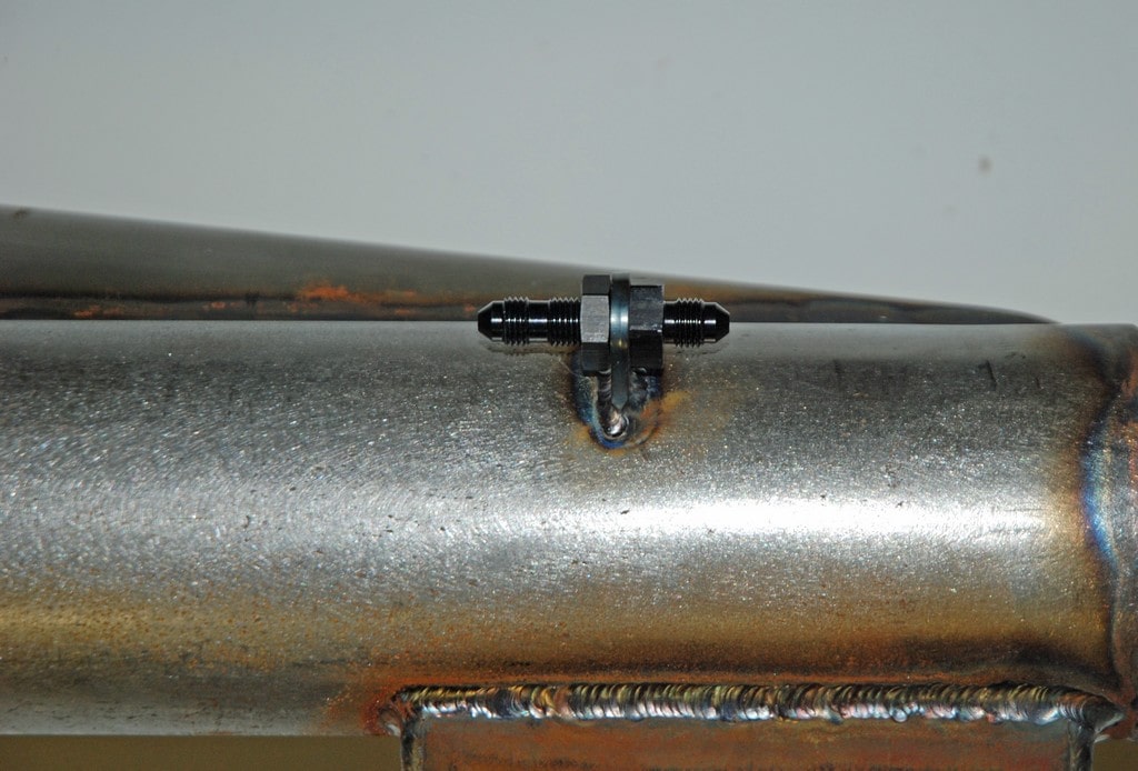 Something else (small) you’ll note in the photos is a pair of brake line tabs welded to the top of the housing. They’re six inches from the end. The idea here is simple: We like to run a short Teflon-lined brake hose from the wheel cylinder (or caliper) to a -3AN bulkhead fitting on the housing. The reason for the short length of brake hose on the housing is to make for much easier access at the wheel cylinder or caliper. From here, hard line goes over each end of the housing ending at a “T” on the top. By the way, Smith was also responsible for adding the tabs to the housing.