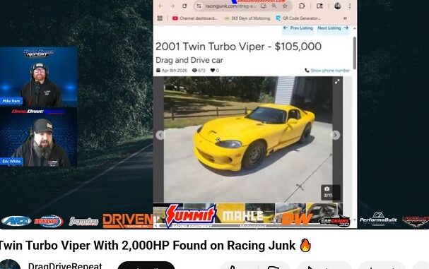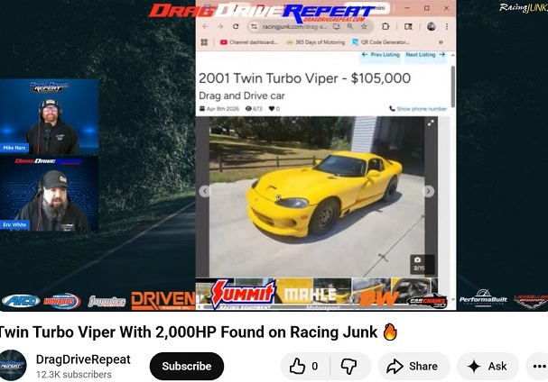 In this episode of “Found on RacingJunk”, Michael and Eric of Drag Drive Repeat dive into the world of the Dodge Viper. This polarizing powerhouse is mourned by the enthusiast and mocked by those who JUST DON’T GET IT! First up is a 2001 Twin Turbo that makes 2000 HP which would make a fantastic drag drive racer. And spurred on by the (completely justified appreciation for the VIPER), they dig into other available Viper’s on RacingJunk. Check out the episode and let them, and us know if you’d race one of these? Or if you remember the hullabaloo when it debuted and blew its competition out of the water.