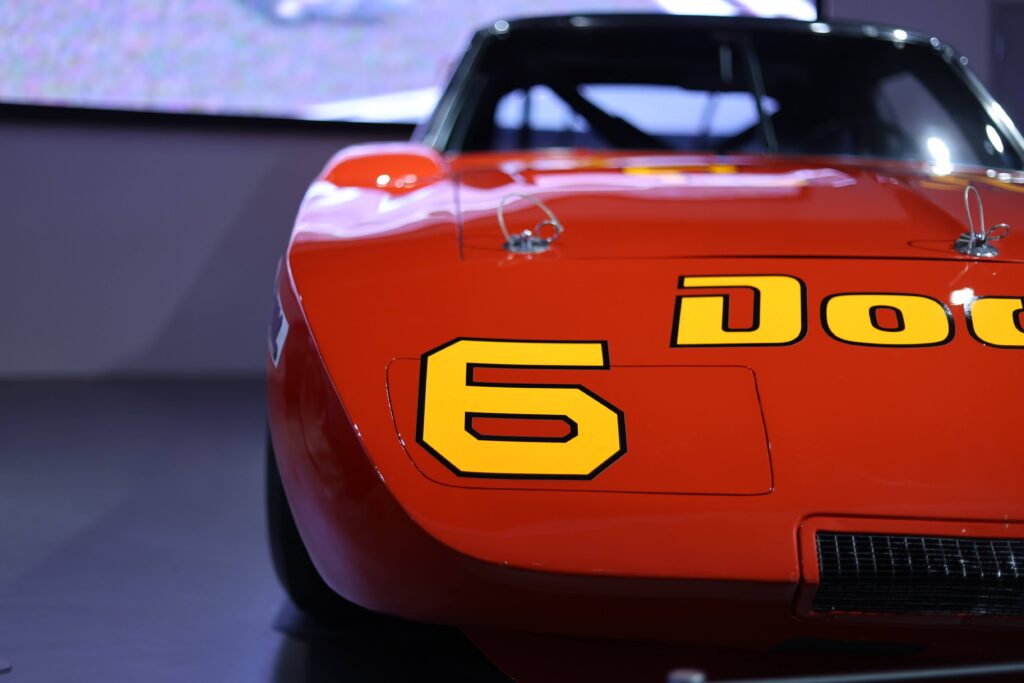 The exhibit also pays tribute to land speed and stock car racing with vehicles like the 1957 Teverbaugh & Kirkland Bonneville Special, notable for being the first car equipped with a parachute. Other highlights include the 1957 Chevrolet 150 Utility Sedan “Black Widow” by SEDCO, the 1969 Dodge Charger Daytona, driven by Buddy Baker to break the 200 mph barrier on a closed course, and the 1972 Alpine A110 1800 Group IV from the inaugural World Rally Championship. Fans of drag racing will appreciate the 2010 John Force Racing Ford Mustang, driven by John Force to secure his 15th NHRA Nitro Funny Car Championship.