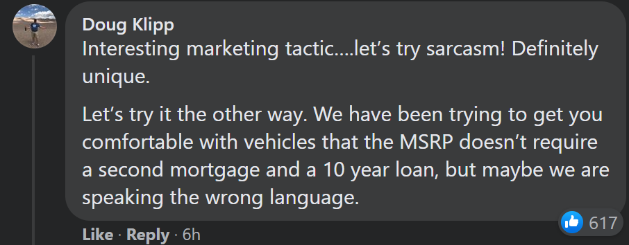 The post was meant to be tongue in cheek but many commenters were critical of Ford’s stance more so of their new price points with the new EVs instead of the EVs themselves. Facebook user Doug Klipp wrote: