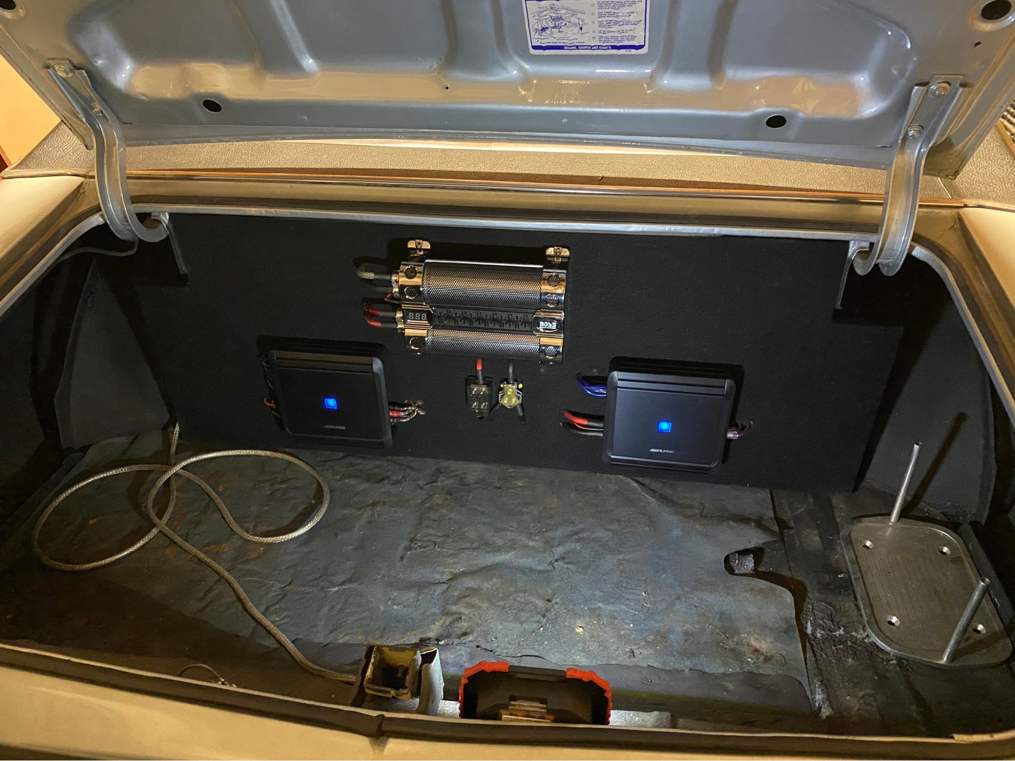 With the engine sorted, he turned his attention to the interior. First, he installed 500 watts of Alpine power for the door and package tray speakers, then another 500 watt Alpine for the subs. Even over rougher roads, he can hear his music clearly.