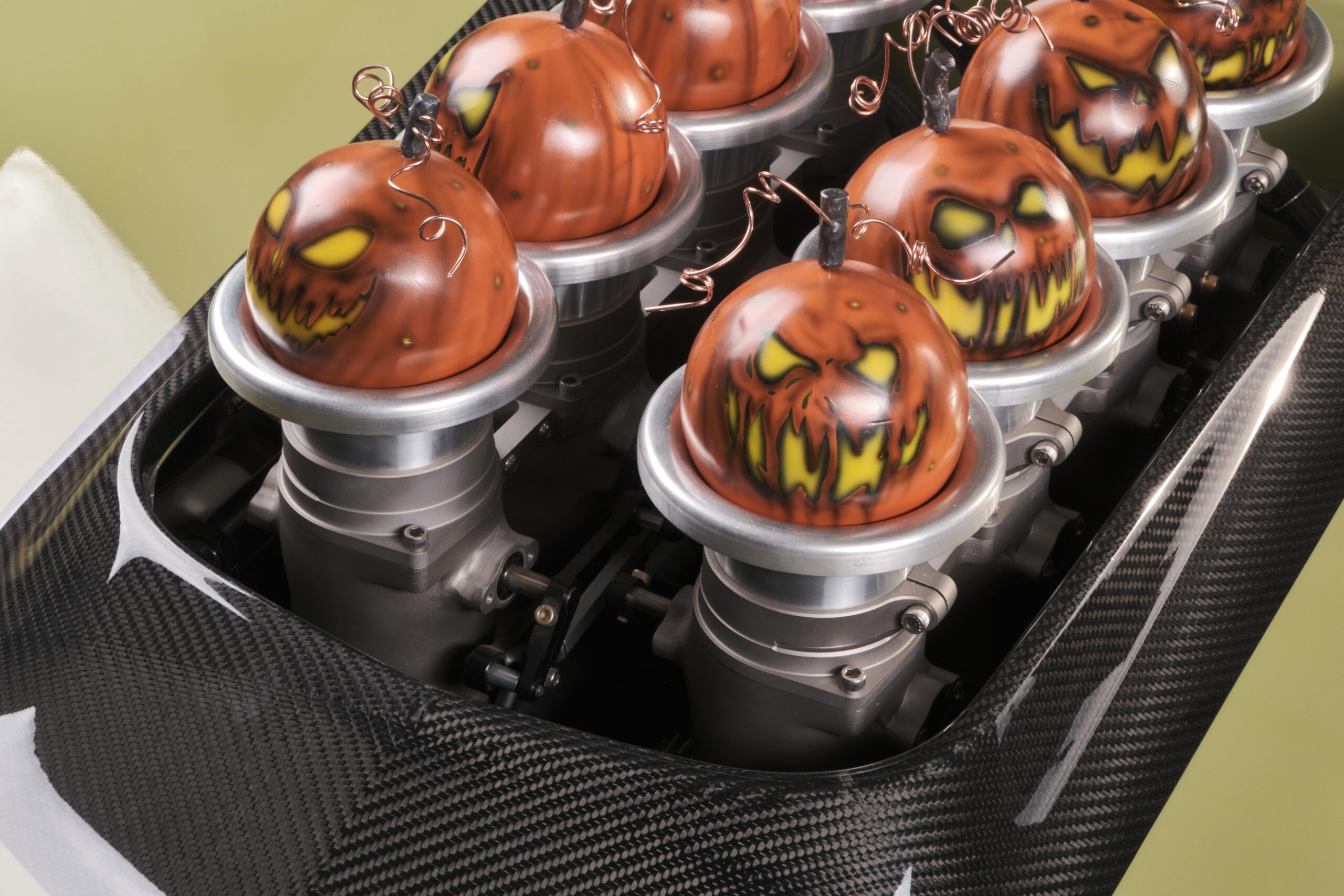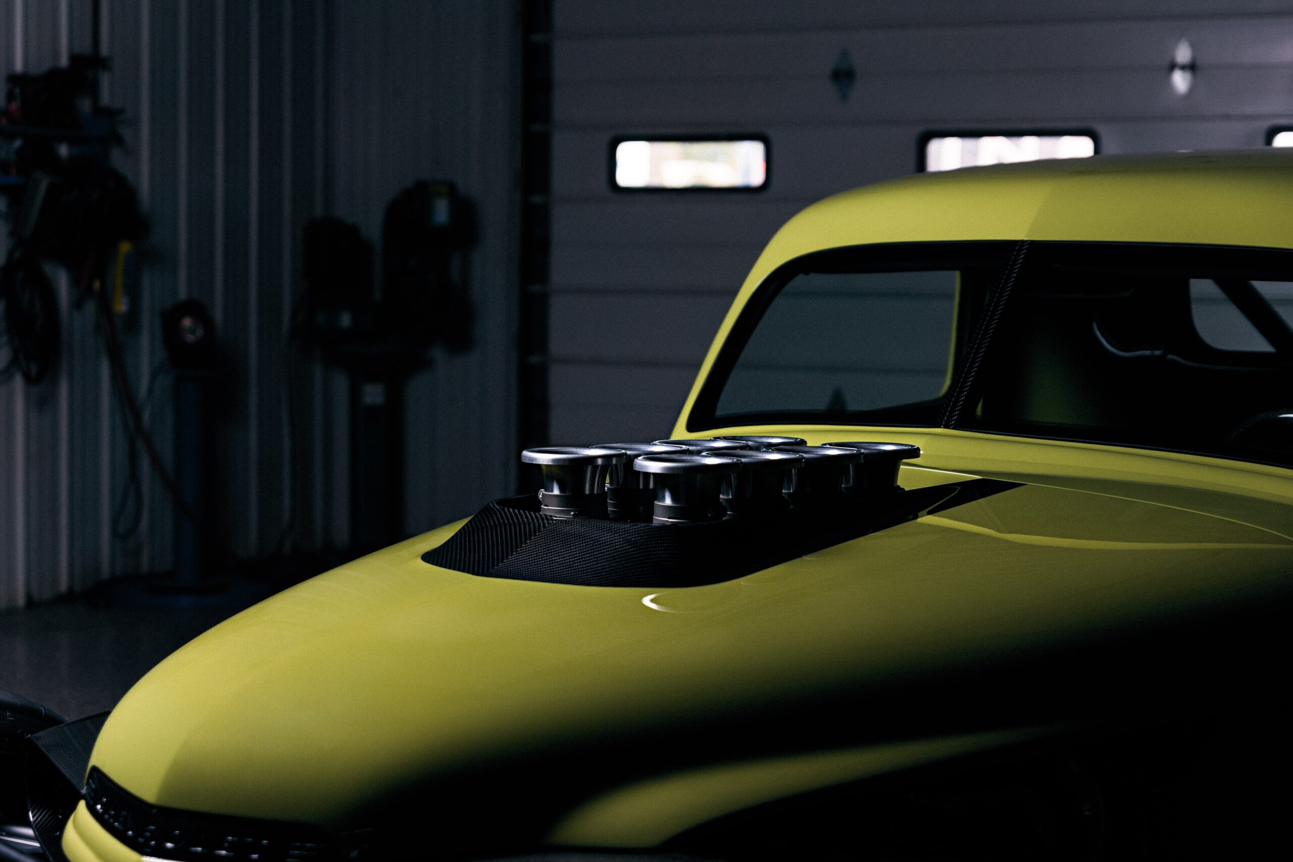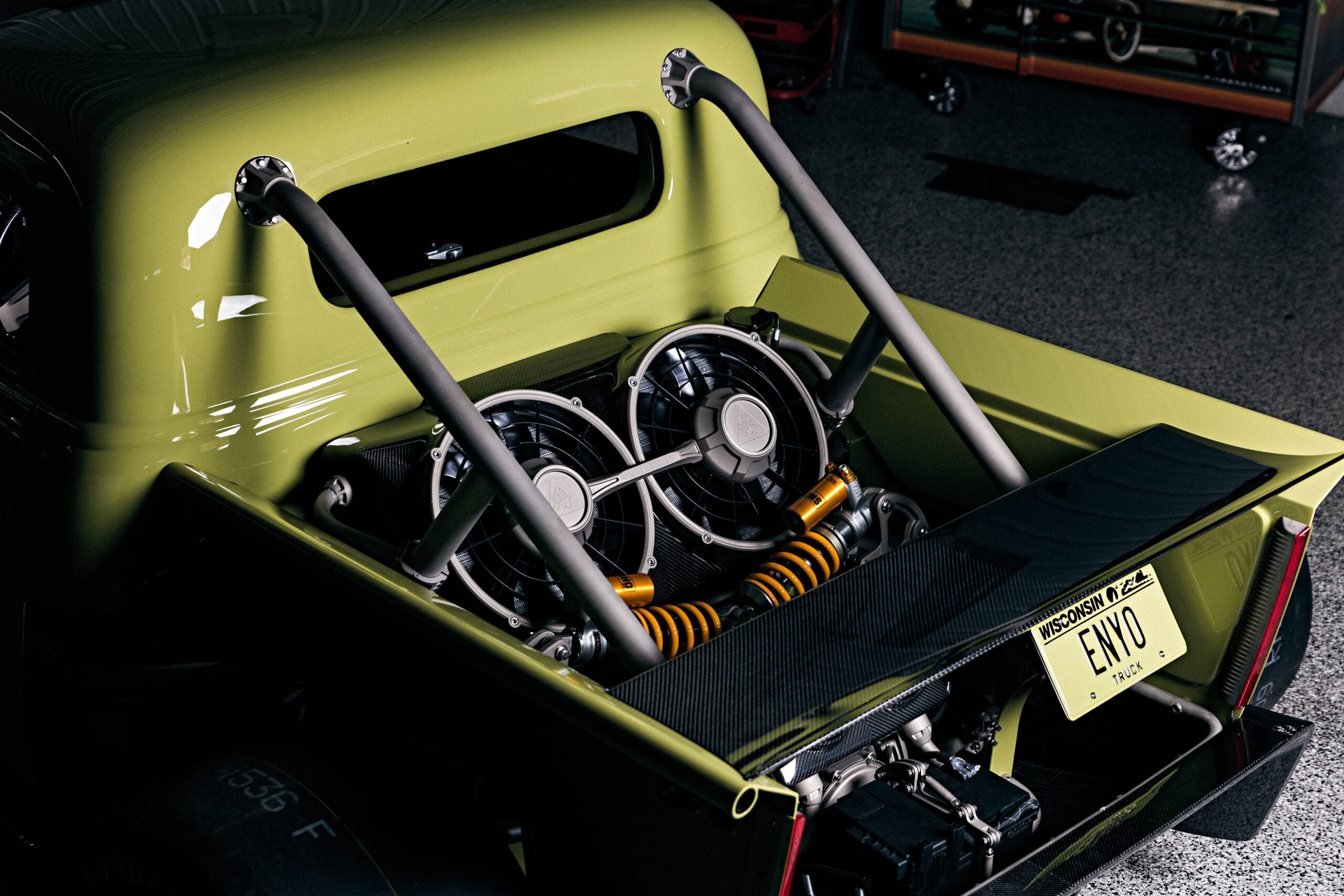 With the original steel cab narrowed, lengthened, chopped and wedge cut, ENYO’s body was crafted with extensive use of carbon-fiber components, including a single-piece carbon-fiber belly pan. The design incorporates cantilevered independent suspension at all four corners and is powered by a 1,000-horsepower big-block marine racing engine. It’s a ’40s work truck meets Formula 1 racer for Ringbrothers’ most extreme build yet. ENYO will be unveiled on Tuesday, Nov. 1 at 2 p.m. at the Mothers booth #22357