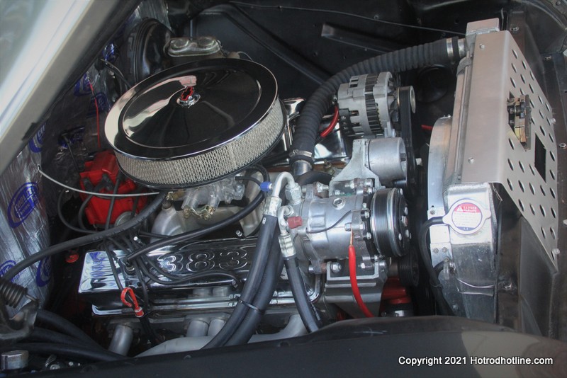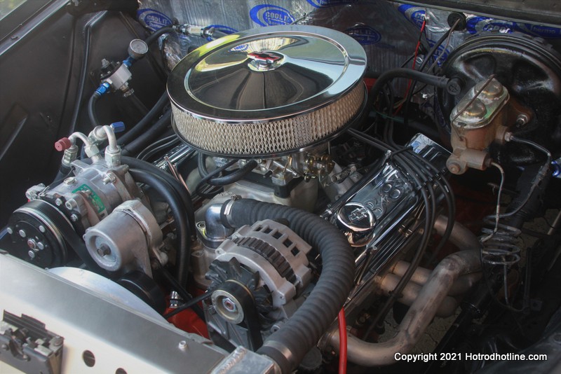 The engine has a bunch of goodies and go-fast goods like a Thumper Cam, Competition Aluminum heads, Roller rockers, Eldebrock dual plane manifold, Eldebrock AVS2 650 carb, MSD Ignition, Holley Electric fuel pump, and a mechanical racing fan. Jeff chuckles when he also says that he made a neat fan shroud out of his wife's cookie sheet pan! Hooker headers vent all the gasses out through custom two and a half inch dual exhausts with Flowmaster 40 series mufflers and, best of all - electronic cut outs (which he uses quite regularly, he says with a big grin!).