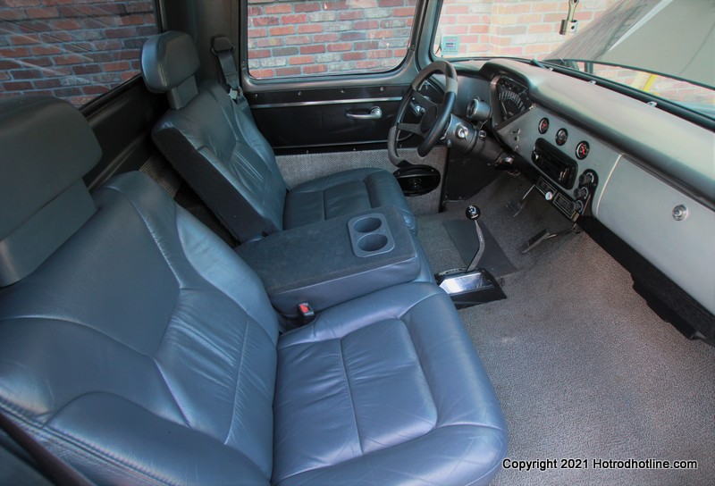 The interior is a modified Durango back seat cut down into buckets in grey vinyl. Gauges are Bosch throughout, including the tach. The tunes are Kenwood with 4 - 6x9 3-way Pioneer speakers and 12-inch subwoofers boosted by a Kenwood receiver and Sony Explode amplifier. A stock early Camaro tilt steering column and wheel steers her down the highway easily, thanks to the power steering assist. It also rides on air shocks by Monroe, stopping pretty nicely with the front disc/rear drum set up. It rolls on a gorgeous set of Boyd Coddington Junkyard Dogs in a Gunmetal Grey finish. It's shod with 20's all around by Nitto (245/45R/20's front, 275/45R/20's rear).