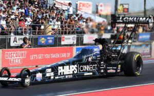 While Hagan increased his lead over reigning titleholder Ron Capps and his Ron Capps Motorsports Toyota GR Supra to 19 points (both exited in the semifinals), Green holds third-place points, followed by Robert Hight and his John Force Racing Chevrolet Camaro SS, Alexis DeJoria (out in the first round) with her Toyota GR Supra, Tim Wilkerson’s Mustang, Tasca III, Todd, John Force’s Camaro and Cruz Pedregon with his Dodge Charger SRT Hellcat. Blake Alexander (Mustang) and the Funny Car of Alex Laughlin hold 11th and 12th place points. The lag from Hagan to Pedregon is 372 points.