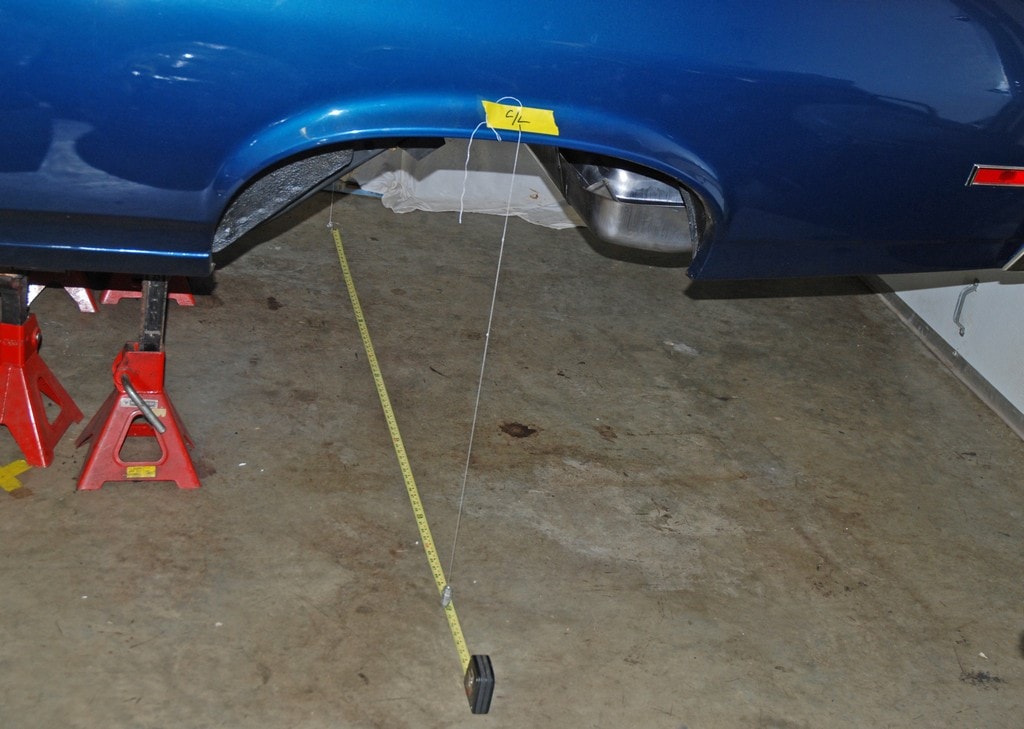 First things first: See the scribbles on the tape? One of the things we’ve done is figure out the centerline of the rear axle in relation to the body. In truth, in stock form, some cars don’t really have the back axle centered in the wheel well. It’s not really difficult to nail down the the axle centerline either: Assuming everything is square, just measure between the leading and trailing edges of the lower fender and split the difference. That’s the “C/L,” or “center line,” mark on the fender.