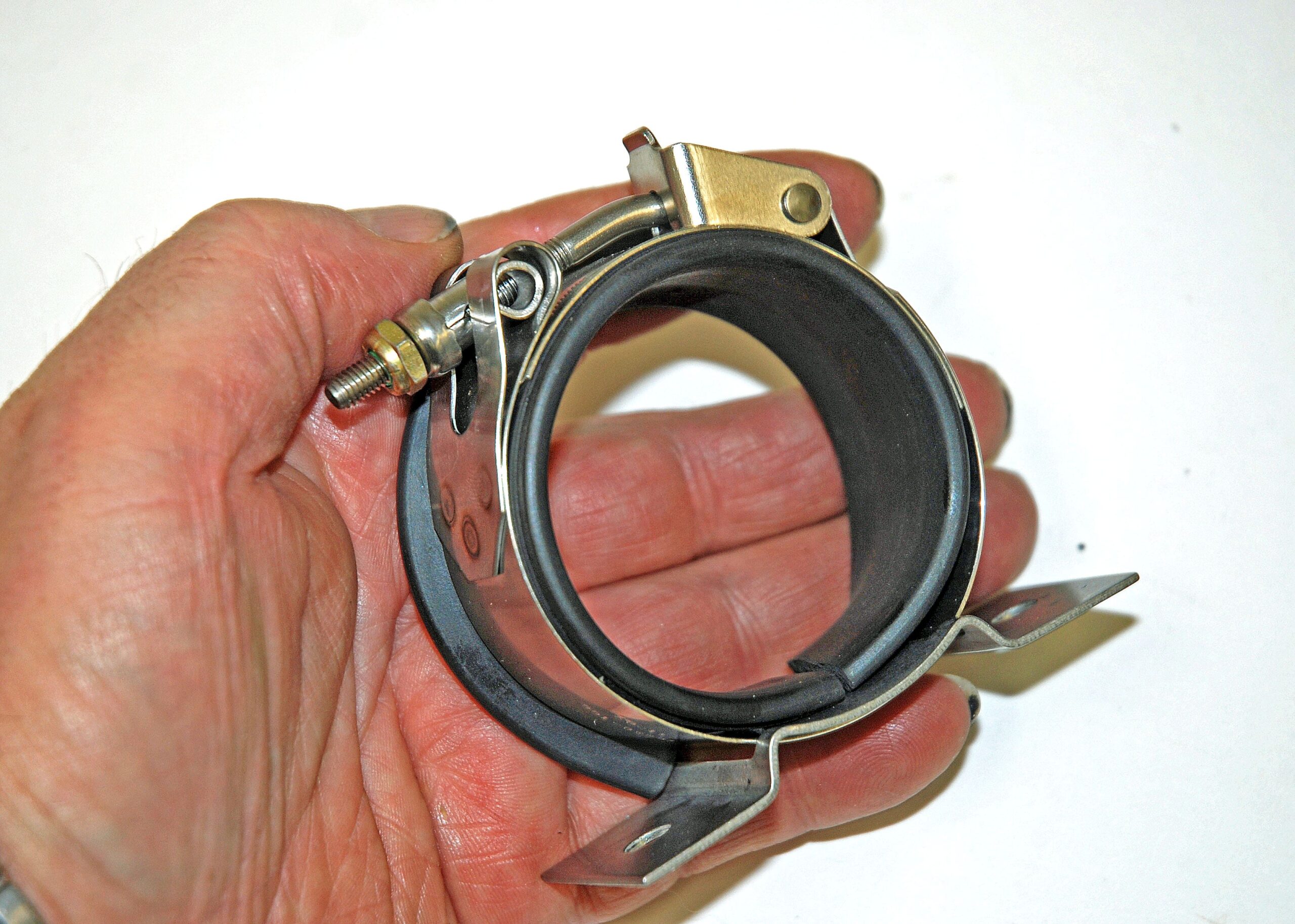 The clamp is setup to accept 2-1/2-inch diameter fuel pump bodies. The high quality MagnaFuel filters I use measure just over 2-1/8-inch in diameter. While the aircraft band clamp is adjustable and can take up some of the difference, it can’t shrink a full 3/8-of an inch. Solution? It’s simple: Install a band of rubber inside the clamp. Not only does it work (very well), it also soaks up any vibration transmitted by way of the fuel fuel pump.