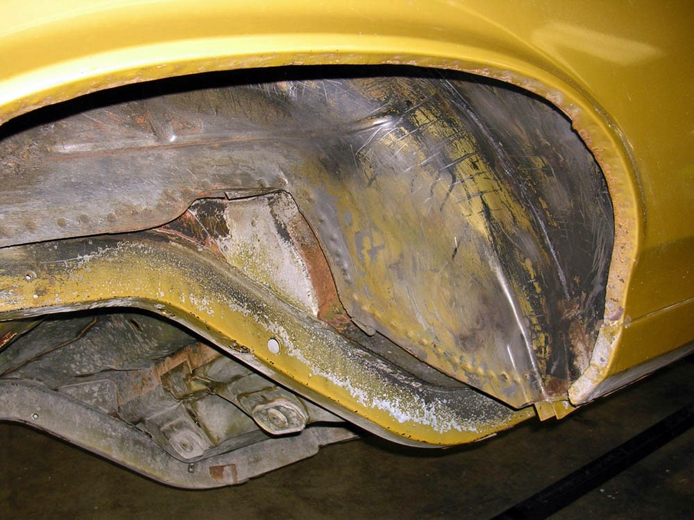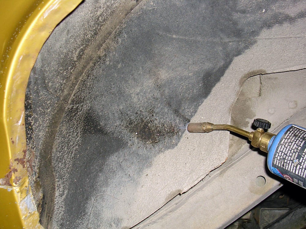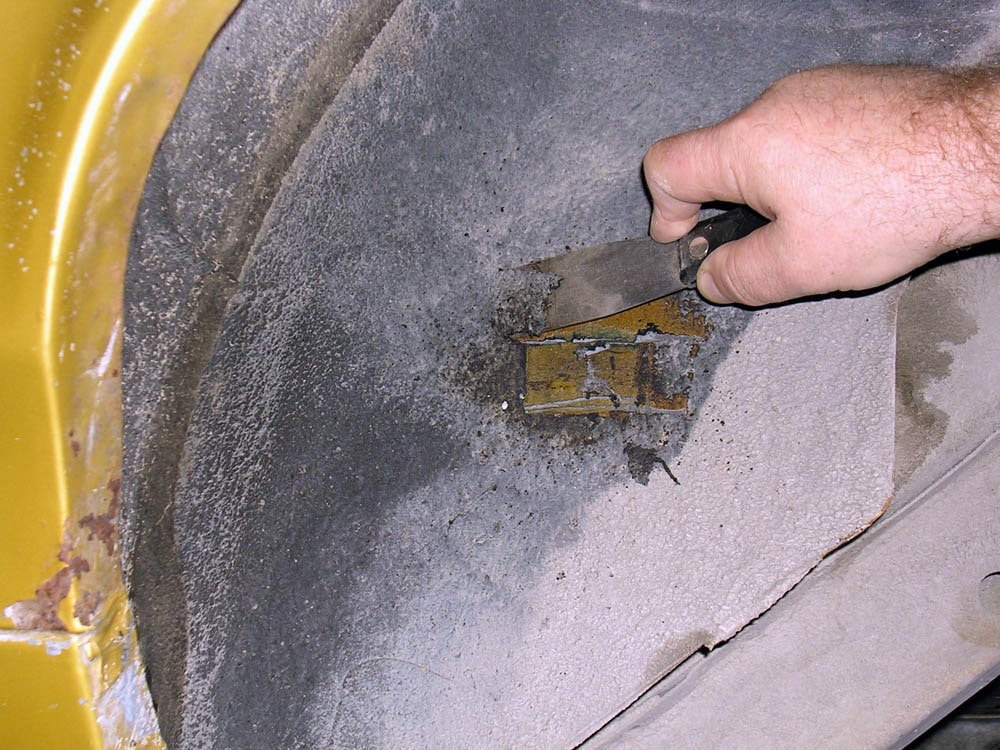 In most cases, vintage cars are undercoated in the wheelhouses (mainly in the rear) along the rocker panels and in the area to the rear of the wheelhouses. To be honest with you, there's no easy way to remove undercoating. Some of the goop is so tough; it's pretty much unfazed by sand blasting. The only solution is to heat the mess with a propane torch and scrape it off. This isn't difficult work, but it's definitely tedious. Once heated, work quickly, because the undercoating hardens immediately as it cools. Usually, only a small section (approximately 6" X 6") can be stripped at once. After all of the big chunks are removed, soak the area with brake cleaner or oven cleaner and scour with the Scotchbrite pad (don't forget to use your rubber gloves). Wipe off the residue with a rag and re-soak the area with brake cleaner. Use another Scotchbrite pad and clean the surface again. You should be down to bare or clean painted metal.