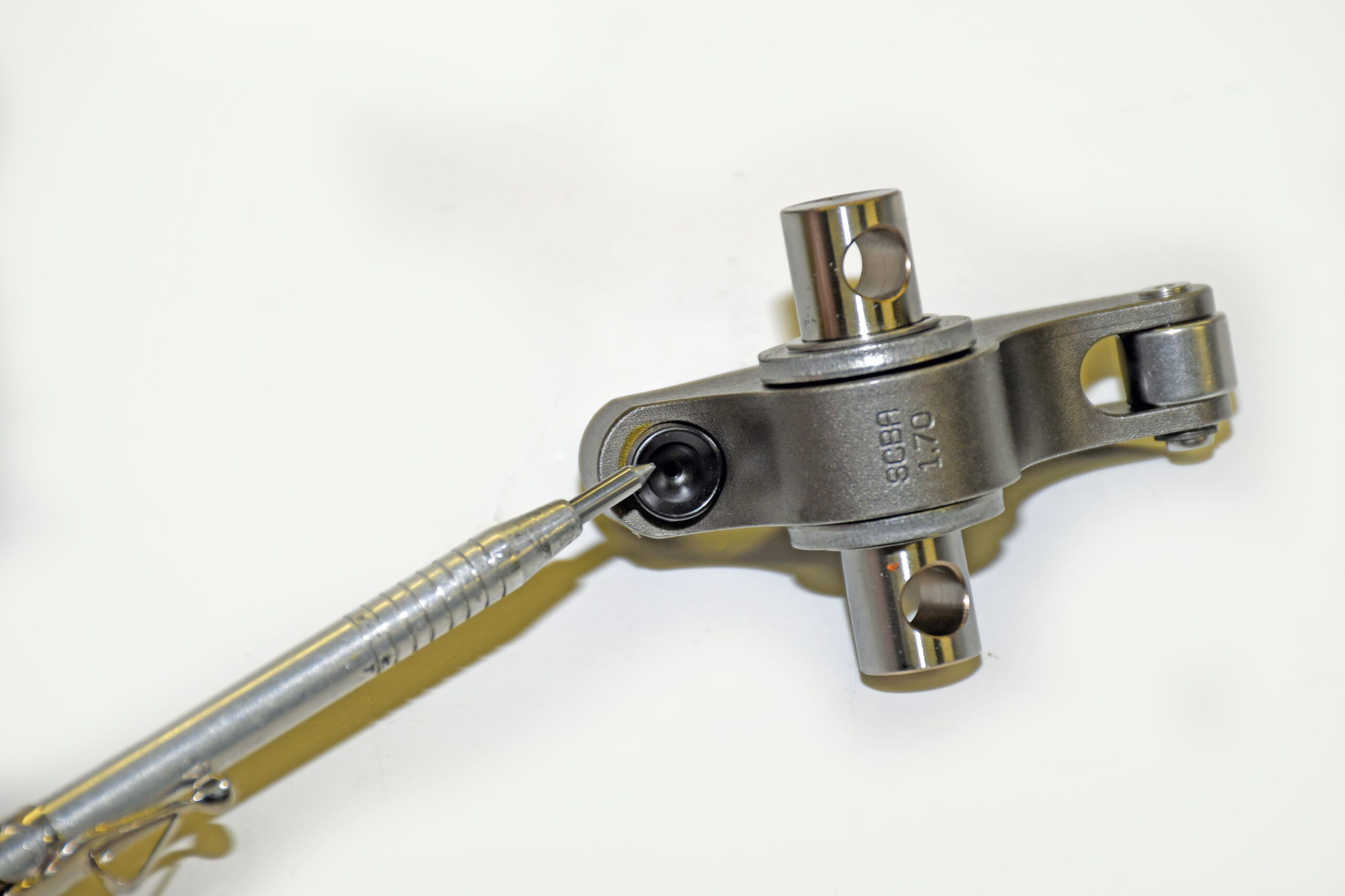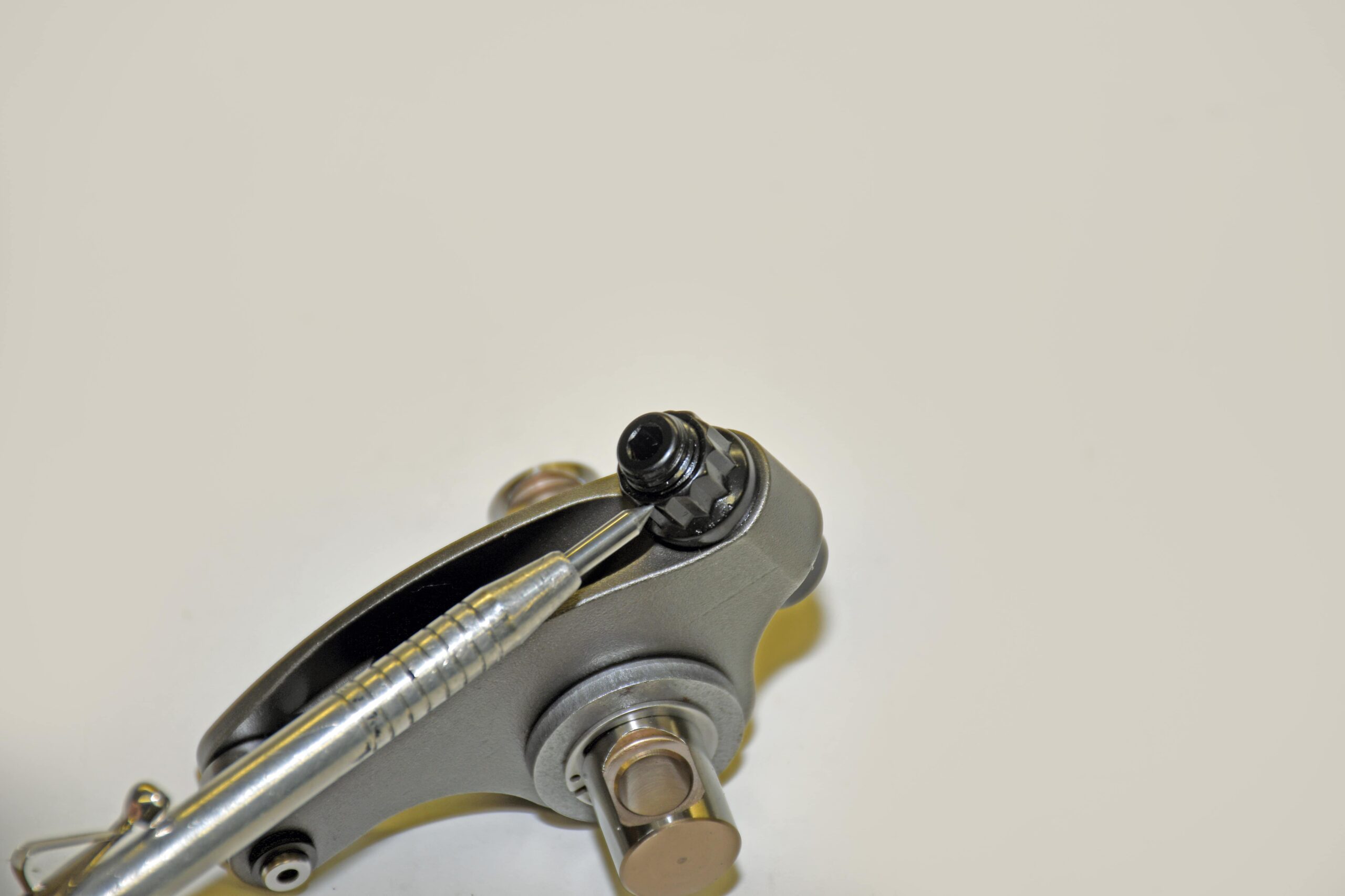 Further to this, Jesel does not recommend running the adjuster turned out more than two revolutions from the fully seated position (the operating range of the lash adjuster is ¼ to 2 turns out from the seated position). All rockers shipped from Jesel with the adjuster set at one full turn from seated. Operating an engine with the adjusters more than two turns out puts excessive loads on the cup area and it might lead to premature failure of the adjuster. If the adjuster is less than ¼ turn from the seated position, use a shorter pushrod. Never modify the adjuster counterbore to compensate for a pushrod that is too long!