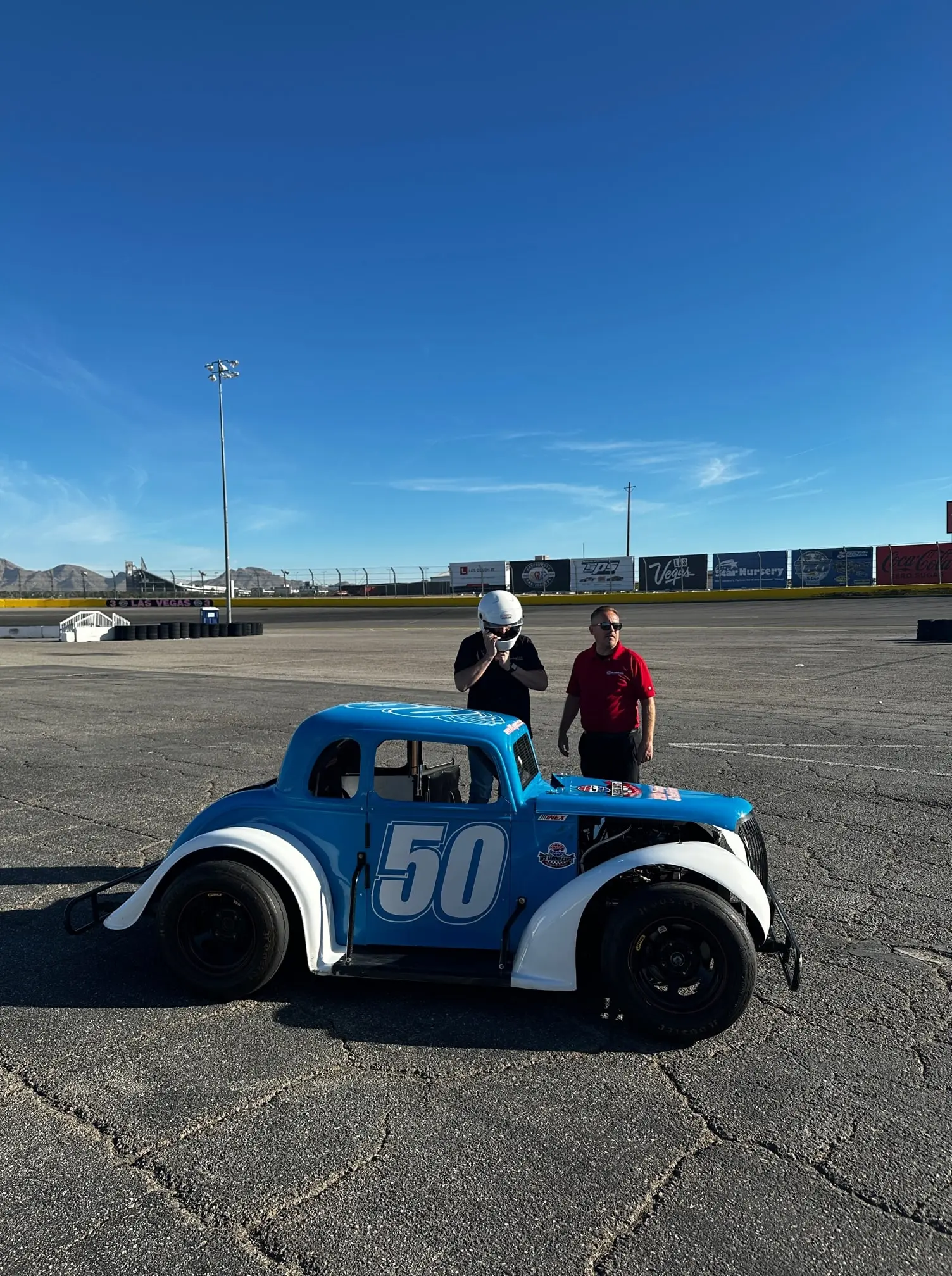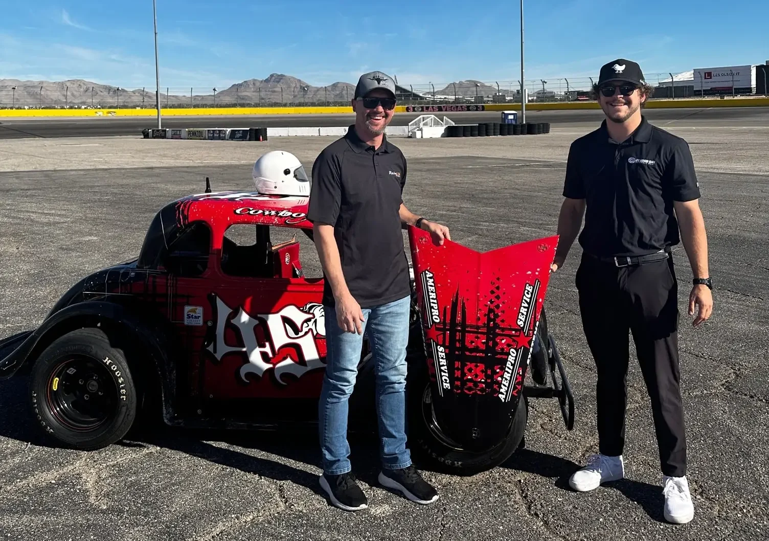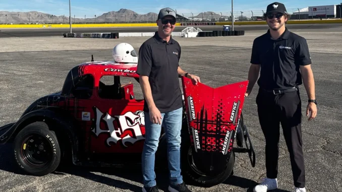 US Legends Cars brought media out to the LVMS track to give them a real taste of Legends racing, complete with a safety team and SIM Racing to practice, and it’s safe to say they were hooked. Chalmers first took the training car out onto the short track on a gorgeous fall morning with military jets training overhead, in and out of the surrounding canyons. After a few laps in the training car, Chalmers switched to the second vehicle the team had brought out, one tuned for a young racer.