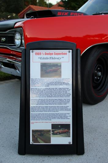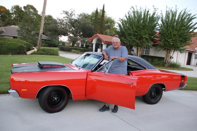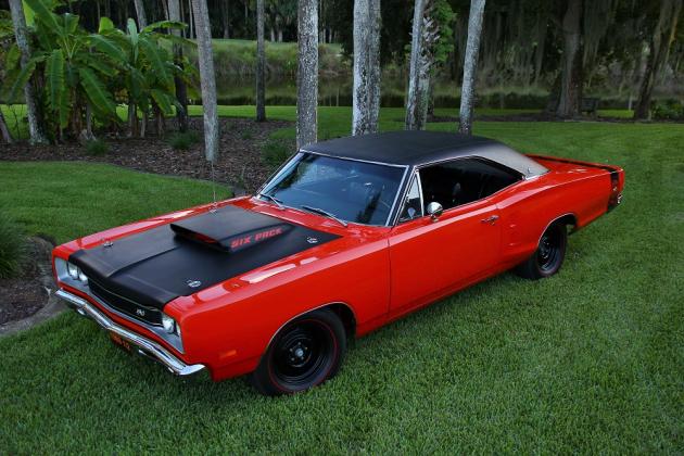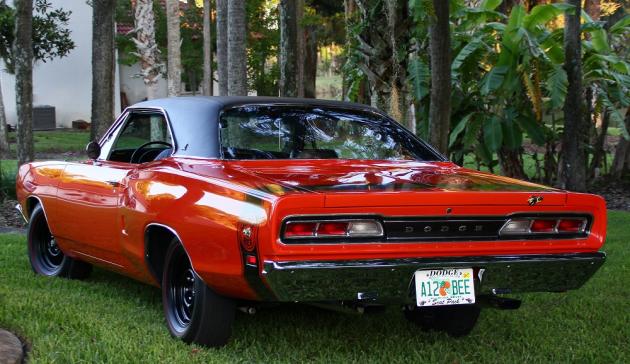 This vehicle is an original, Galen Govier documented, "M-code" special order 1969 1/2 Dodge Coronet Super Bee with the A12 package. It is owned by Dave and Pat Abernathy of Plantation Bay, Fla. It's complete with a 440 cubic inch motor producing 390 (factory-rated) horsepower, three two-barrel Holley carburetors, 727 Torqueflite automatic transmission, lift-off fiberglass hood, DANA 4:10 gear sure-grip rear end with factory black vinyl roof and "SIX-PACK" badging along with the factory correct date coded "H" wheels and red streak Goodyear G-70-15 tires.
