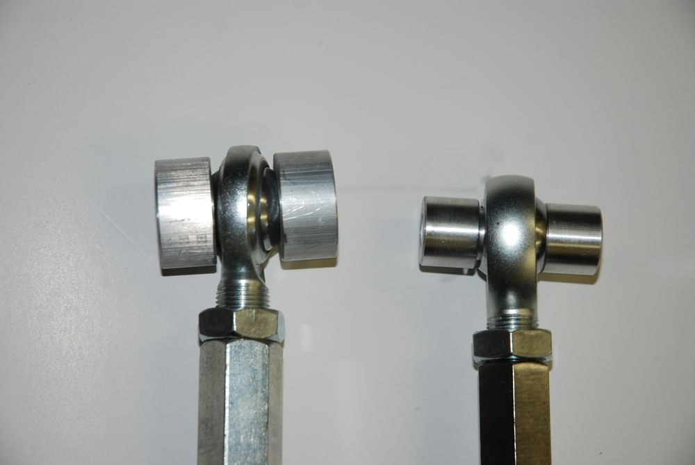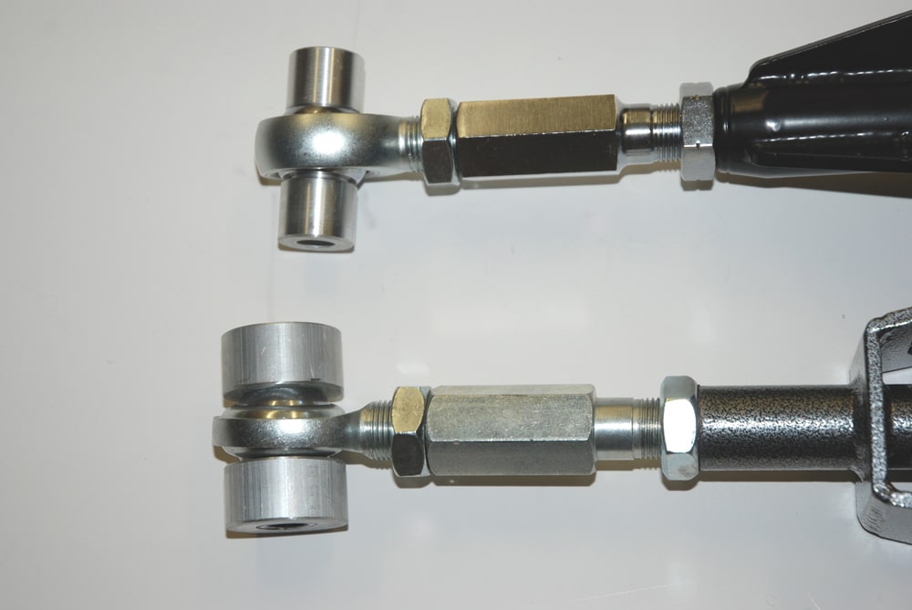 If you have some adjustment in the bars (for example, adjustable uppers and lowers), then you can fine tune the suspension and set the static pinion angle. What’s with big deal with pinion angle? It is a very big deal. In order to keep the driveshaft and u-joints operating in a (more or less) straight line, the pinion angle has to be correct. Typically, the pinion angle is measured between the pinion gear flange and the driveshaft. As the suspension in a car “wraps up”, then the pinion is driven upward (out of whack). To ensure that the pinion is in the correct location under power, it is typically set nose down static. For cars with spherical bearings (rod ends) or solid back suspension bushings, most people strive for a pinion angle of between -1 to -2 degrees (- is negative angle, or pointing “down”). If the car has OEM style rubber suspension bushings, a pinion angle of -3 to -4 degrees is likely more appropriate.