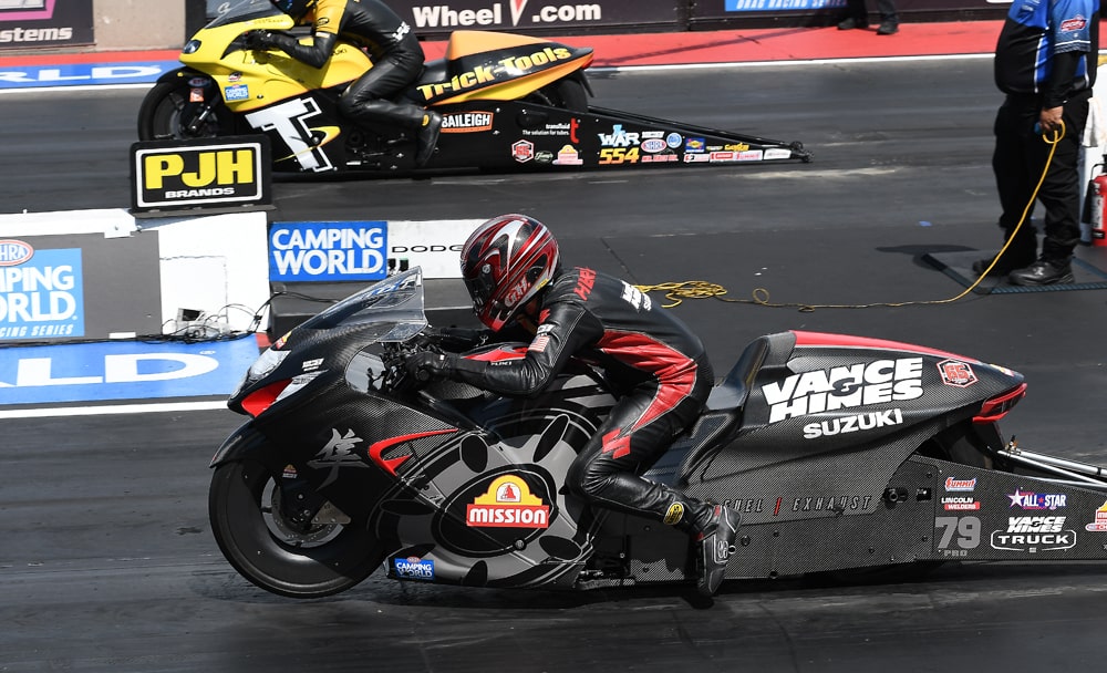 This was Herrera’s first – and last – time racing on Thunder Mountain and he had a rough start to the weekend (at least for him and Vance & Hines), initially qualifying fifth in the 13-bike field. By Saturday night he’d advanced to third place and dispensed with Chris Bostick’s Suzuki in the first round, six-time class champ Matt Smith’s Suzuki in the quarterfinals, rookie Chase Van Sant – having the best run of his first season – in the semifinals before meeting Angie Smith. “I’m glad we bounced back here, especially in front of all these fans at Bandimere Speedway,” Herrera said after advancing his lead over Arana to 219 points. “To be able to bounce back here, of all places, it’s an amazing feeling.” Crew chief Andrew Hines won his first race at this track in 2002!