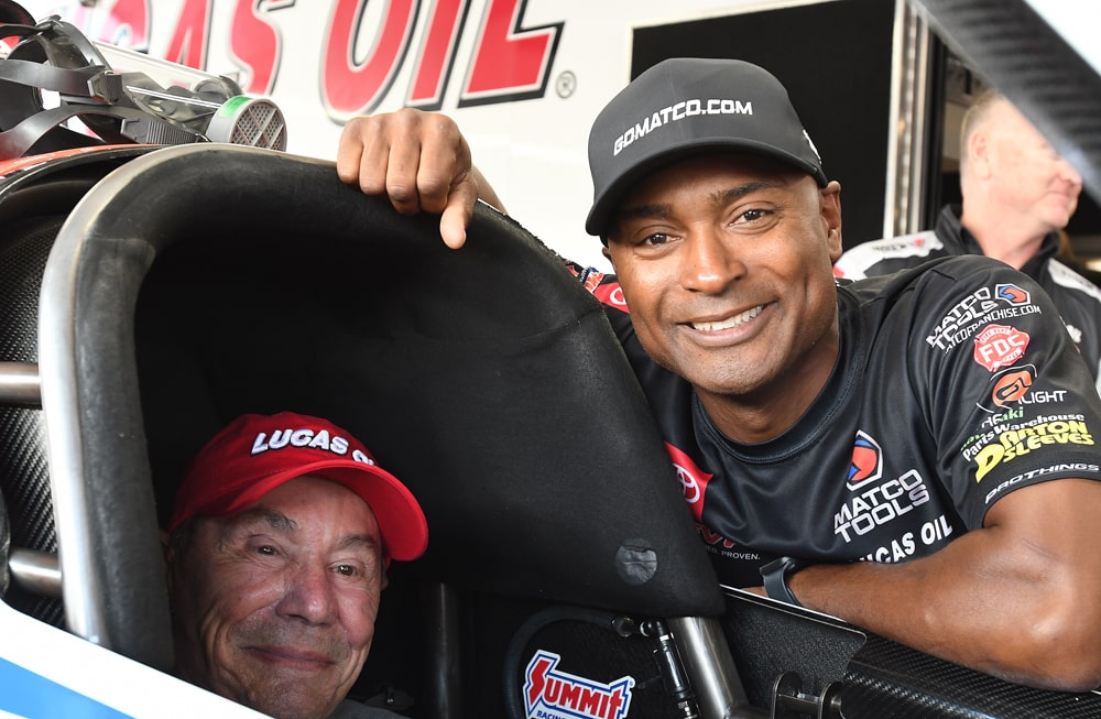 In addition to the “side show” of the Mission Challenge, there was another event that captivated everyone at the track. On Friday afternoon, “King” Kenny Bernstein returned to the track to warm up Antron Brown’s dragster. The 69-race winner hadn’t sat in a car since he retired, but it felt like home to him as Brown, a 72-race winner (and last man to sweep the Western Swing) allowed the legend to start his car after a few minutes to get used to the different controls.