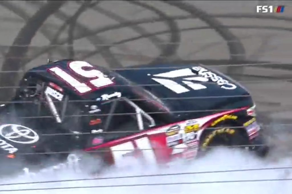 Erik Jones provided the most excitement of the day when he was tapped at the last minute to sub for a sick Kaz Grala in the Kyle Busch Motorsports Number 18. Because he was a sub, he had to start at the back. By the end of the second stage he was up the top five, and he battled Busch hard for the lead for the final few laps of the race. Jones finished the race in second while Dalton Sargeant took the GMS Racing Number 25 to a third place finish.