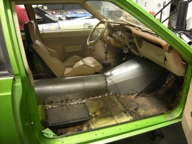 Unfortunately, with the new chassis underneath, it was impossible to turn the 9.5”-wide wheels in front, so they moved the wheel wells forward in the body, flared them, and then found another set of flared fenders and grafted them onto the rear to give the body a sense of continuity.