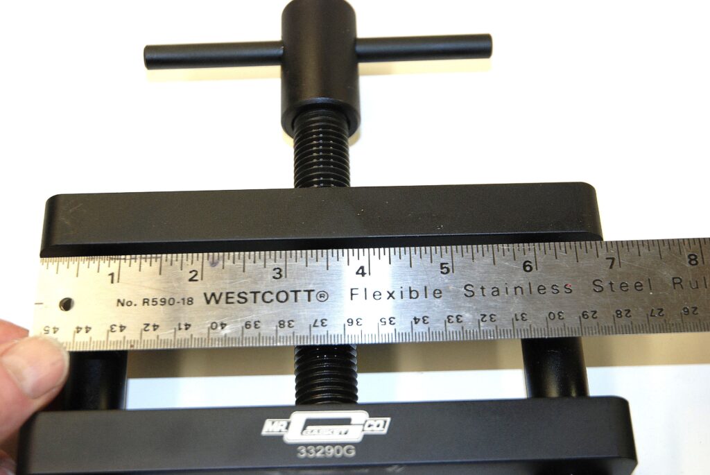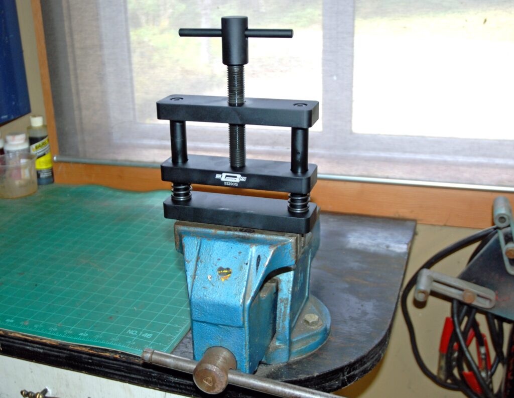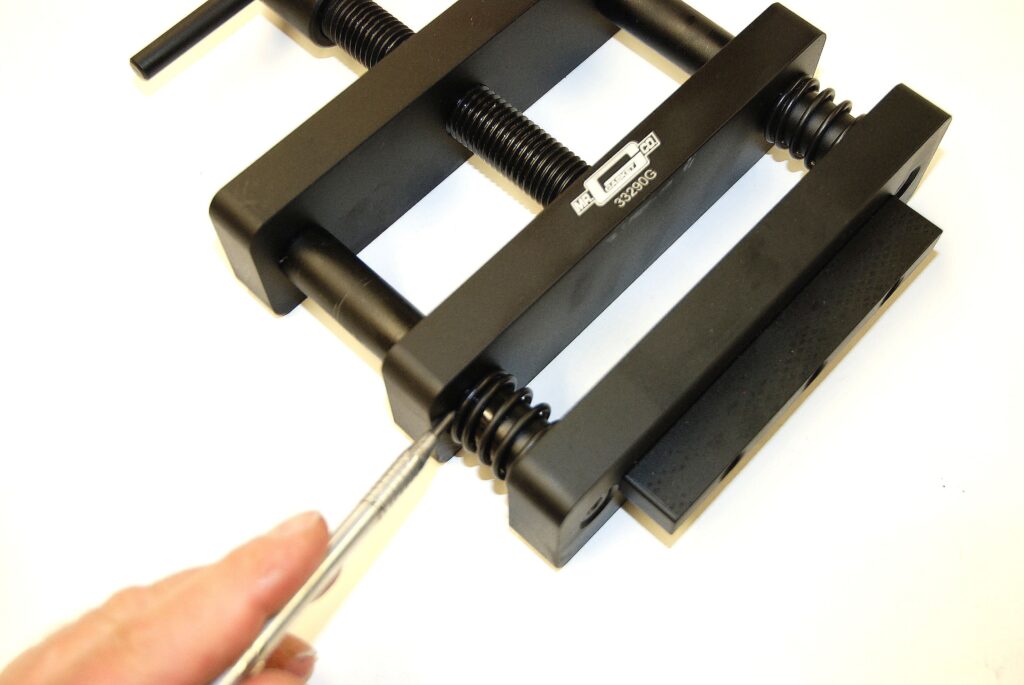 In order to use the vise, you can mount it directly on your bench or (my choice) insert it in your bench vise. The base of the rod vise features a step engineered to fit into the jaws of a bench vise. Given the steel threads of the adjustment bolt running through billet aluminum it’s a good idea to lube the threads carefully (anti seize is perfect here). Ditto with lube on the pair of sprung guide pins on either end.