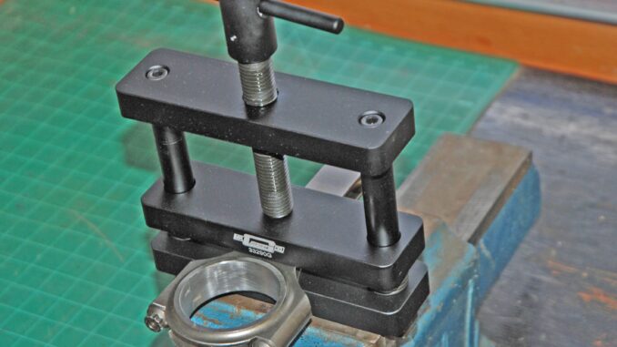 In order to use the vise, you can mount it directly on your bench or (my choice) insert it in your bench vise. The base of the rod vise features a step engineered to fit into the jaws of a bench vise. Given the steel threads of the adjustment bolt running through billet aluminum it’s a good idea to lube the threads carefully (anti seize is perfect here). Ditto with lube on the pair of sprung guide pins on either end.