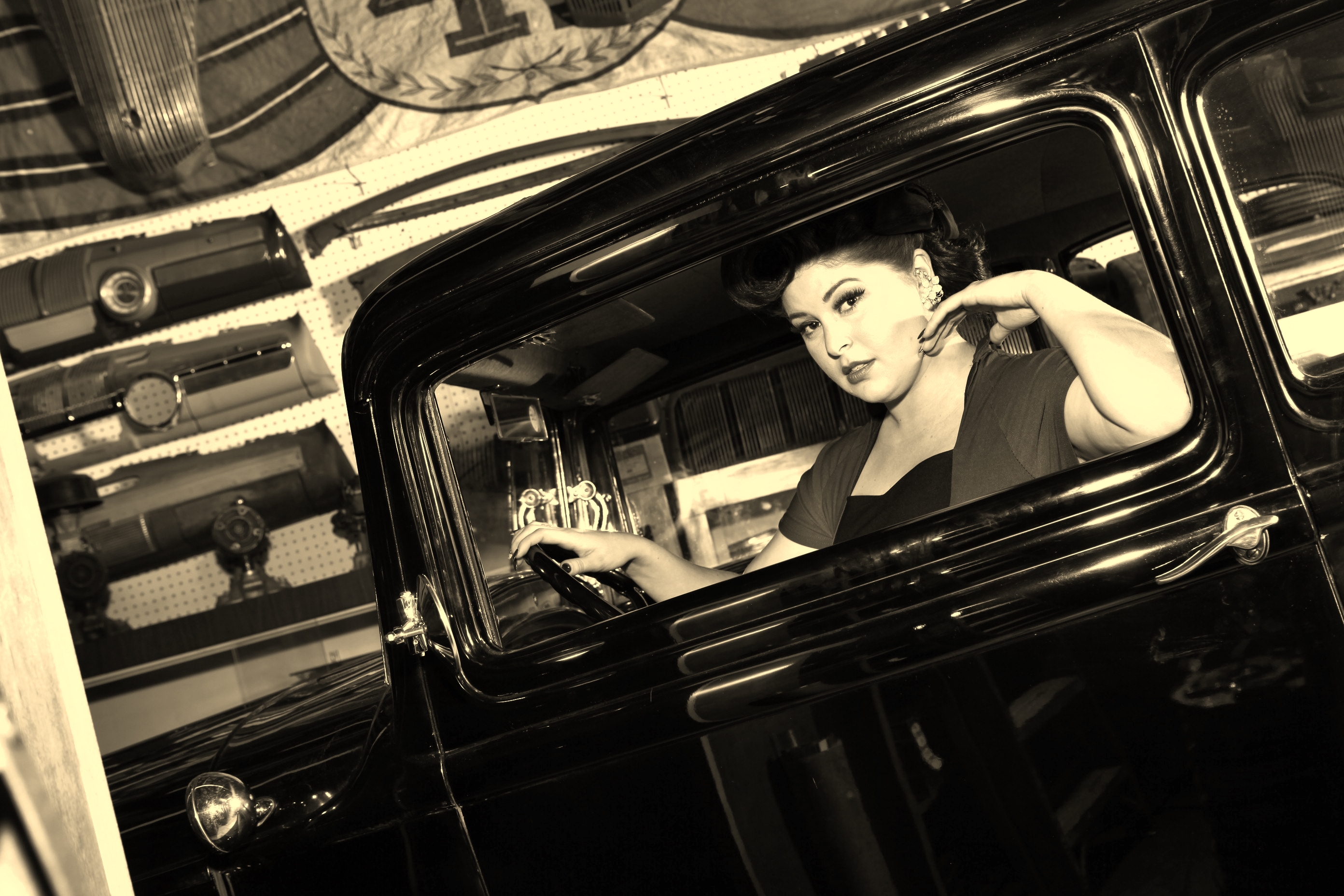 My name is Kerosene Kelly; I was born and raised in Long Beach, Calif. For my entire life, I was a tomboy. My dad and I worked on cars and motorcycles together, I played almost every sport, trained in MMA and worked in my family's Metal Fabrication shop, which my great grandfather started in 1918 (I now run it with my mom). As a child, I always admired the vintage pinups for their class and beauty. I secretly wanted to be one. Finally, I decided it was time to let go of my tomboy side just a little, and be the woman I'd always meant to be. This is when I also decided to start my own reproduction vintage clothing line. I've been sewing since I was six years old, so being a pinup model helped me realize my passion of becoming a seamstress and fashion designer. When I think of a pinup, I think back to WWII and the soldiers pinning the beautiful, classy posters of women to their bunkers. With my reproduction vintage clothing line, I hope to help every girl to keep the class, beauty and poise that the women had back then.