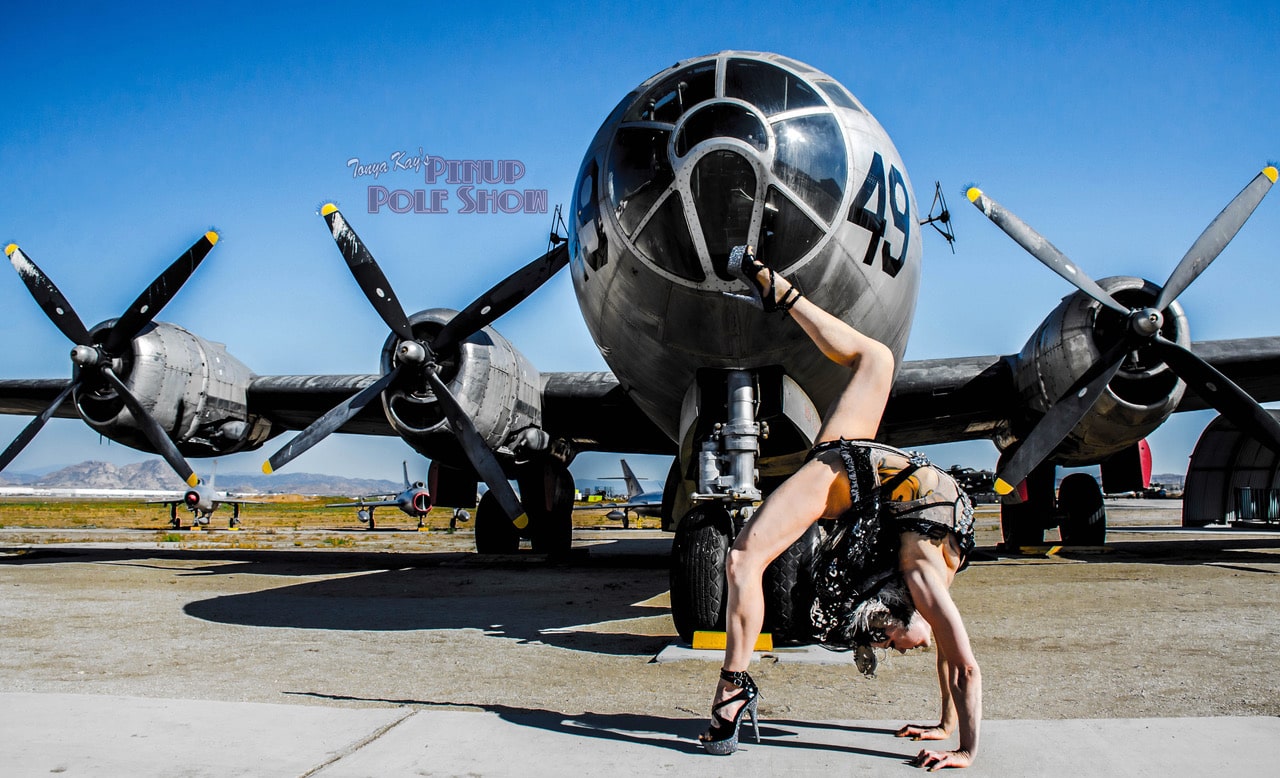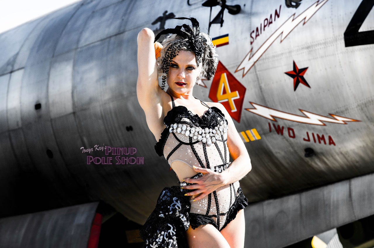 We are venturing out just a little with this week's pinup because we know our audience are speed junkies - whether on the ground or in the air. Brynn is modeling at the March Field Air Museum in Riverside, home to 100 years of retired US Military aircraft, vehicles and aviation history. Among the machines with which you see her pictured is the B-29A Superfortress Bomber. She is wearing wardrobe by Kelly Maglia and footwear by Glitter Heels. Photography is by Jorge F, and this photoshoot featuring Tonya Kay’s Pinup Pole Show was produced by Roni Neroli of Motor Head Barber and Kevin Jakubczak.