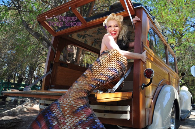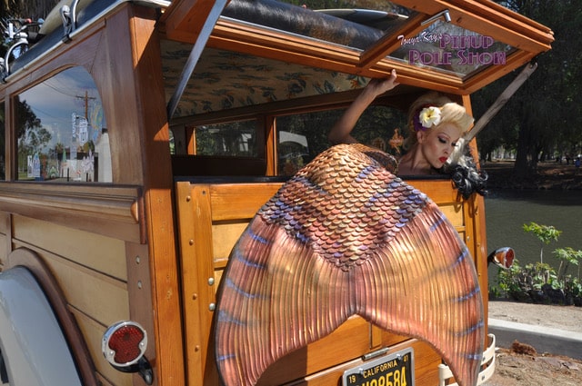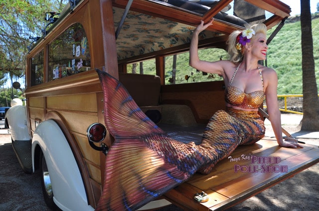 A mermaid in a woody? You bet! This week’s Pinup Pole Show Pinup is none other than our favorite fantasy creature herself, Heather Lou. As a little girl, she may have watched Splash one too many times, because today Heather is a real life mermaid in addition to a singer, fashion stylist and nanny. She volunteers at animal rescues and is a devoted ocean activist because her heart is just that genuine and pure. In California, she stays as close to the water as possible because, “[The ocean] is Earth’s outer space! Lots of undiscovered magic!”