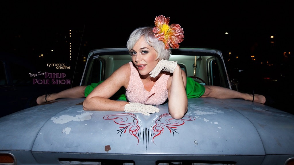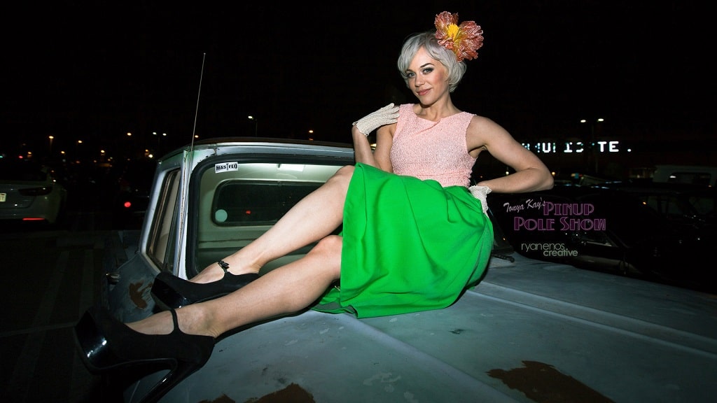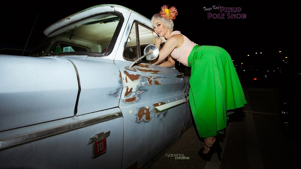 This week’s Pinup Pole Show Pinup of the Week is me, Tonya Kay! I’m the writer of this column, creator and headliner of Tonya Kay’s Pinup Pole Show and a filmmaker who loves classic vehicles.