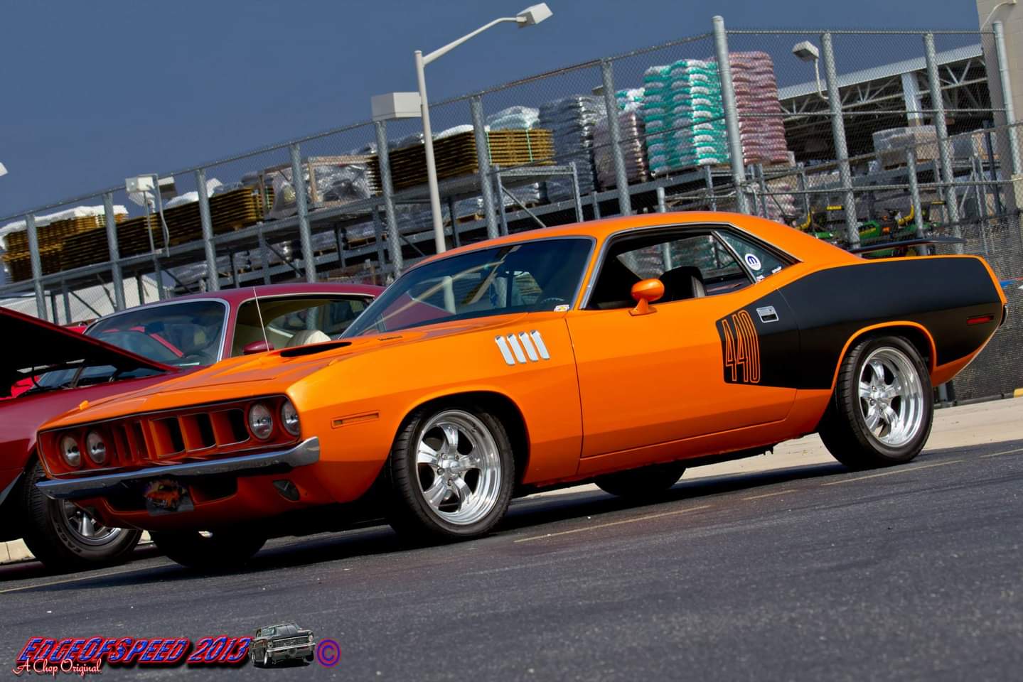 440 6 Barrel TCI SUPER STREET FIGHTER 71 Cuda painted Custom Vitamin C, awards from Mopar Nationals at Carlisle, Cardone Industries Calendar, Billett Specialties Catalog for 5 years representing mopar and Qualifier Wheels. All original sheet metal, real billboard car, 2 tag option.