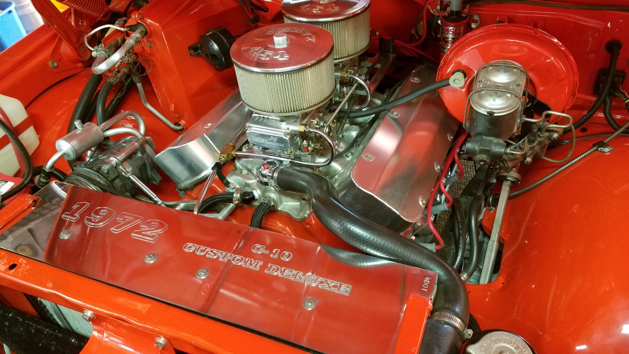 This is a 1972 Chevrolet C10 Custom Deluxe with factory tilt steering, front disc brakes and air conditioning and I've had this truck for over 20 years and love working on it and changing it. Right now we have a 468 BBC with dual Holley 600 cfm carbs, TCI Streetfighter 400 trans, locker in the rear with 3:73 gears, 315/60-15 MT drag radials on the back with a 4/6 static suspension drop. I've done all the work myself except paint