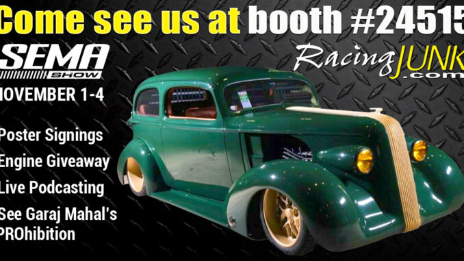 As a way to pay tribute to the race and performance enthusiast, RacingJunk will host The Garaj Mahal’s iconic 1936 Pontiac build, ‘PROhibition” in its booth. The Sinister Green, two-door sedan features a 1100HP BOROWSKI LS3 race engine with a 76MM bullseye turbo, custom fabricated stainless-steel plumbing by the MOD SHOP, a SCOTT’S fabricated chassis and suspension, forged SCHOTT wheels wrapped in massive MICHELIN tires and more.