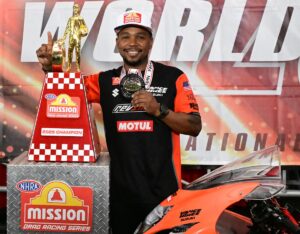 “What a year it’s been! I just wanted to win a Wally [winner’s trophy] but this year ended up bringing so much more: four wins, three No. 1 qualifiers and a No. 1 plate!” Coming into the Countdown second in points with two victories, Gadson broke through by winning the four-wide race in Charlotte and adding his fourth victory of the season at Dallas after qualifying first. After Herrera won in Las Vegas, Gadson came to Pomona with a slim,, 21-point advantage; points-and-a-half were on offer for this race and, for this rider, it meant a different way of racing,